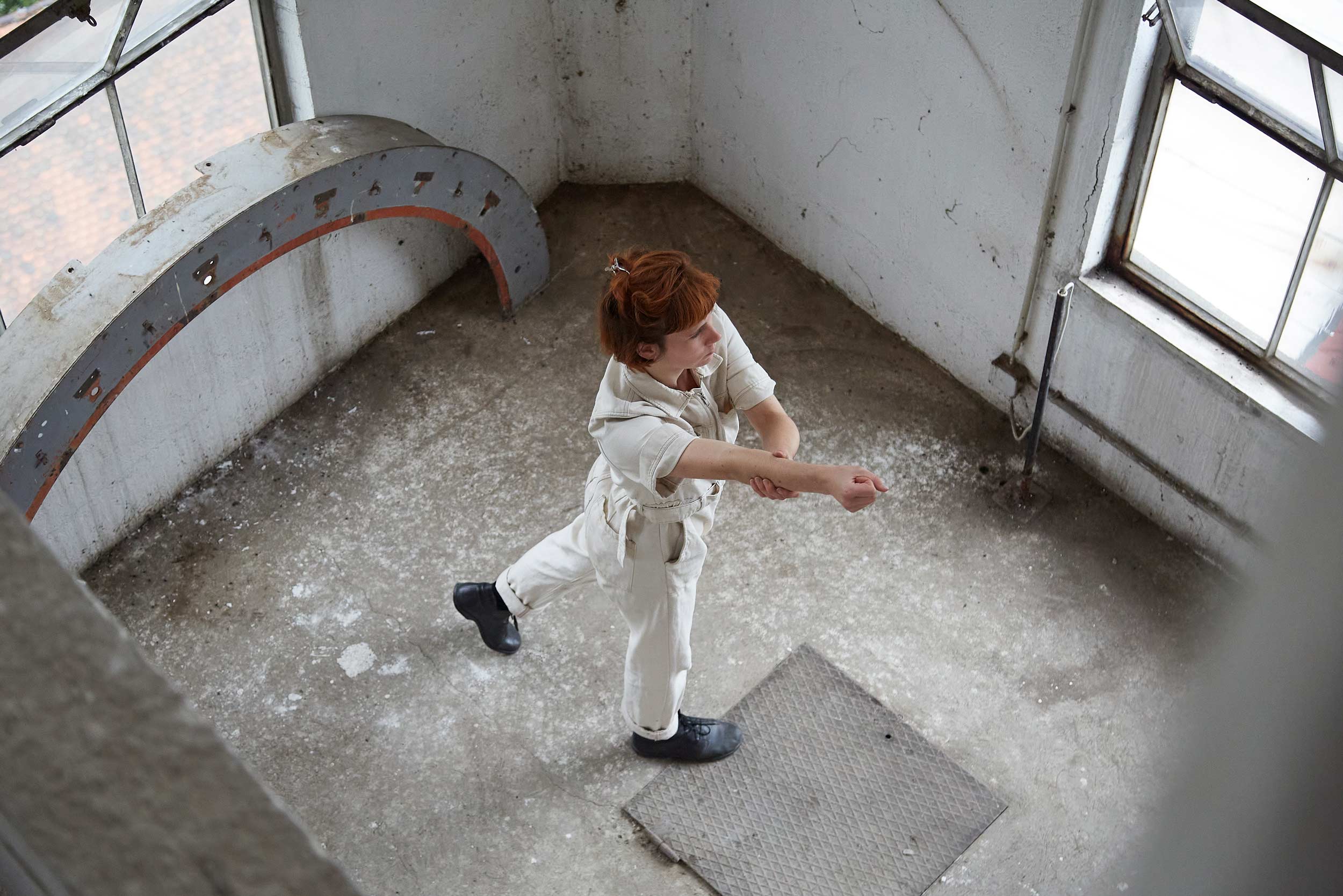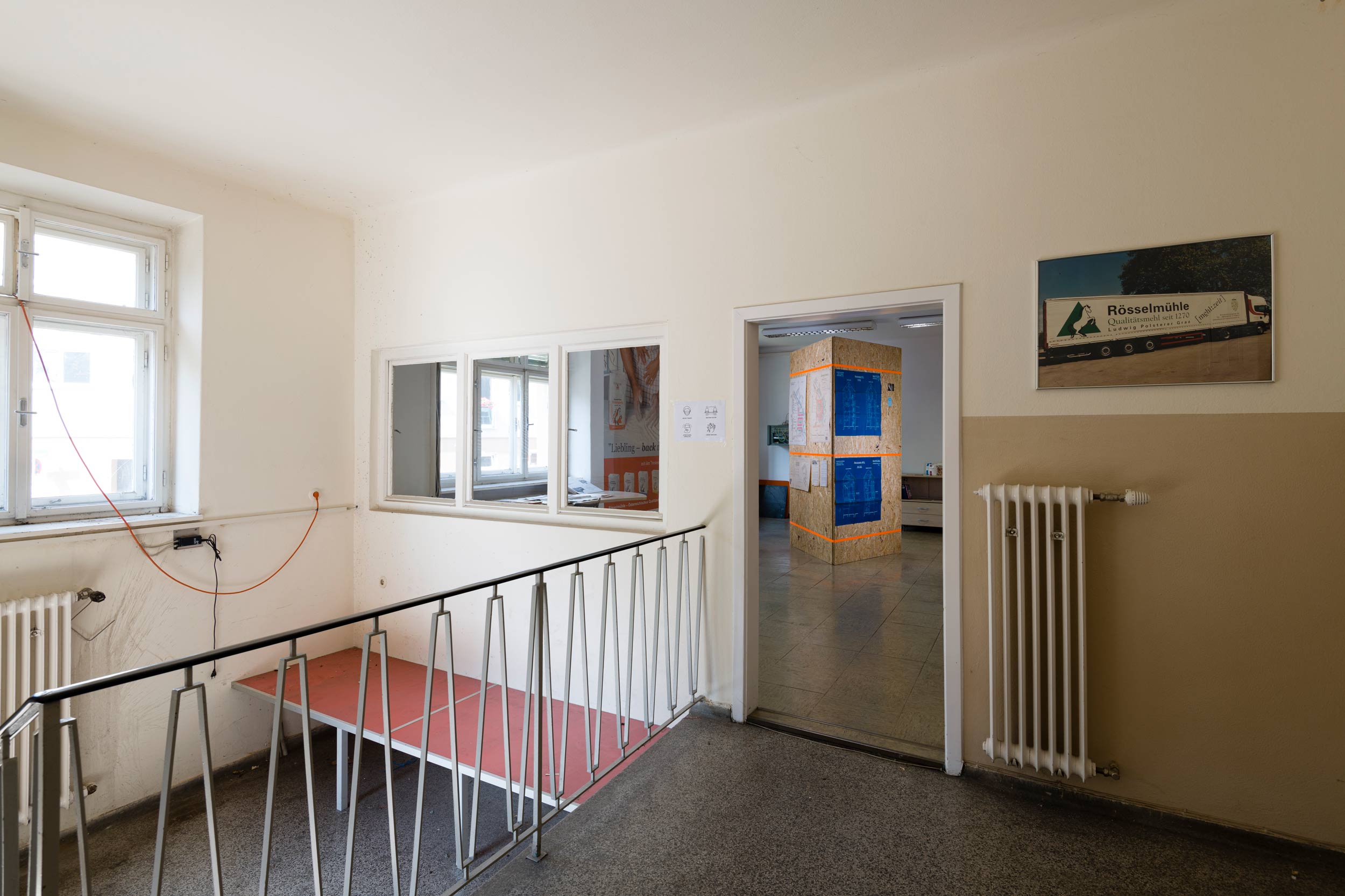 Pflanzen wuchern[6] in einem verbrannten Gebäude am Rand des Geländes. Die Nachbarin ruft aus Angst die Polizei, als sie Geräusche von splitterndem Glas hört. Über den schon labil eingedellten Zaun gesprungen können die vier Einsatzkräfte die befürchteten Jugendlichen nicht festnehmen. Ein Vertrag mit der Besitzerin legitimiert die Präsenz der randalierenden Künstler*innen[76], die zerbrochene Fenster mit einem Hammer von möglichen Verletzungsgefahren säubern, um die Auflagen für Veranstaltungen zu erfüllen. Handläufe werden angebracht[70], Löcher geschlossen[42], Stoßkanten markiert[37], Stolperfallen beseitigt[38], Statik geprüft[71], Toiletten in Betrieb genommen. Aus dem Arbeiterhaus[13]fällt wieder Licht auf die Straße.