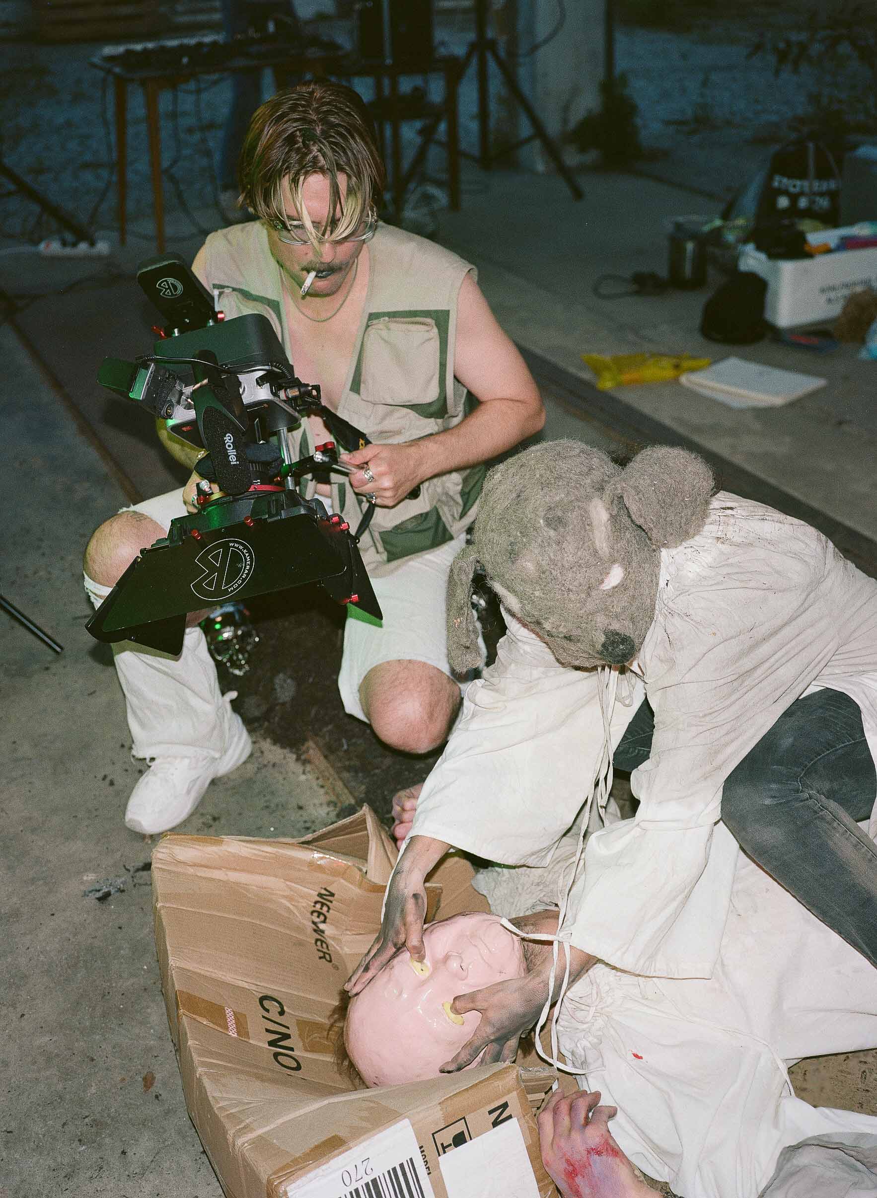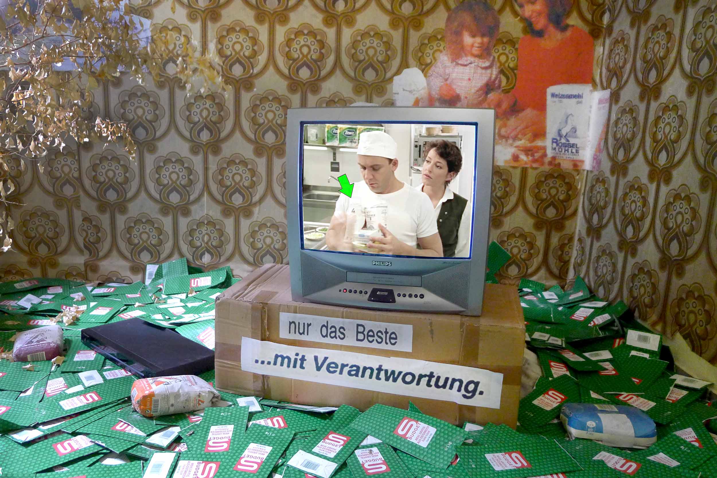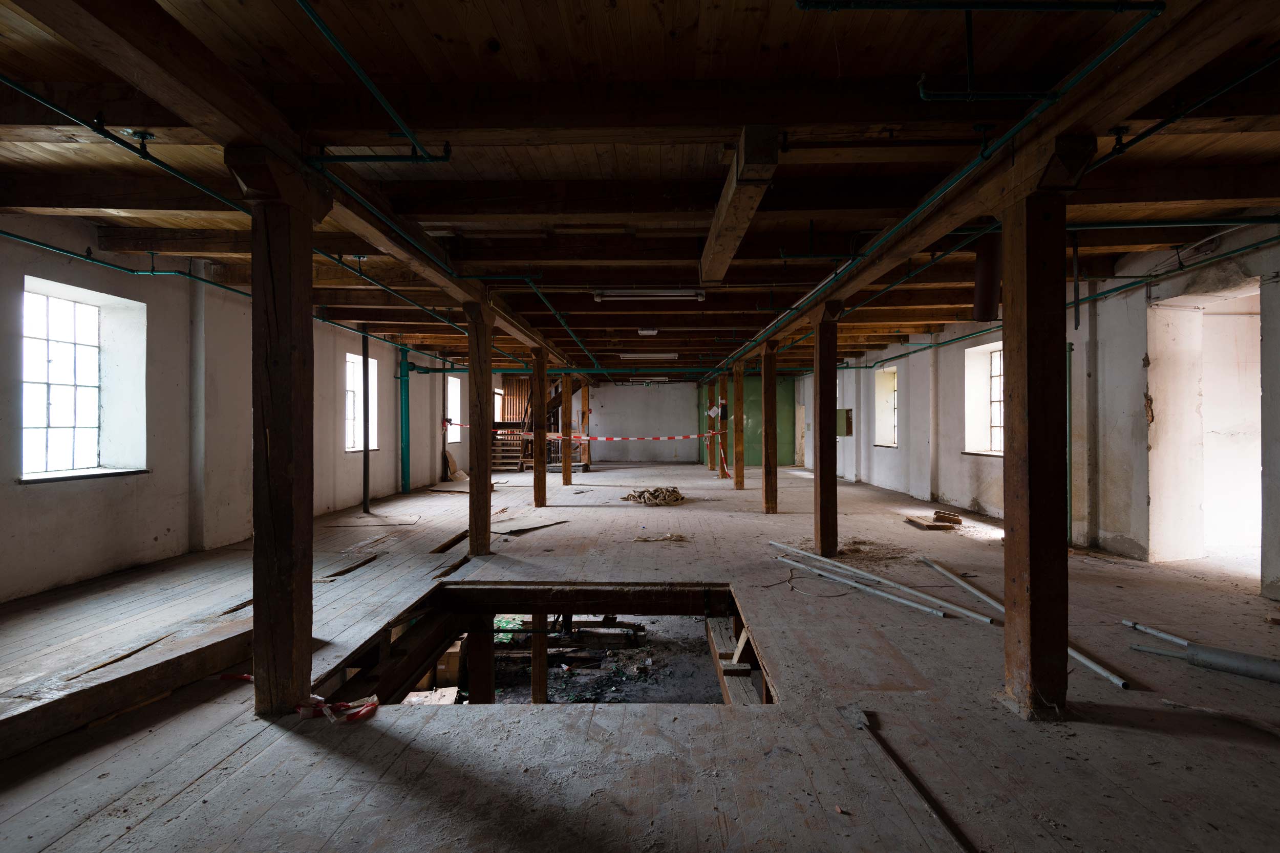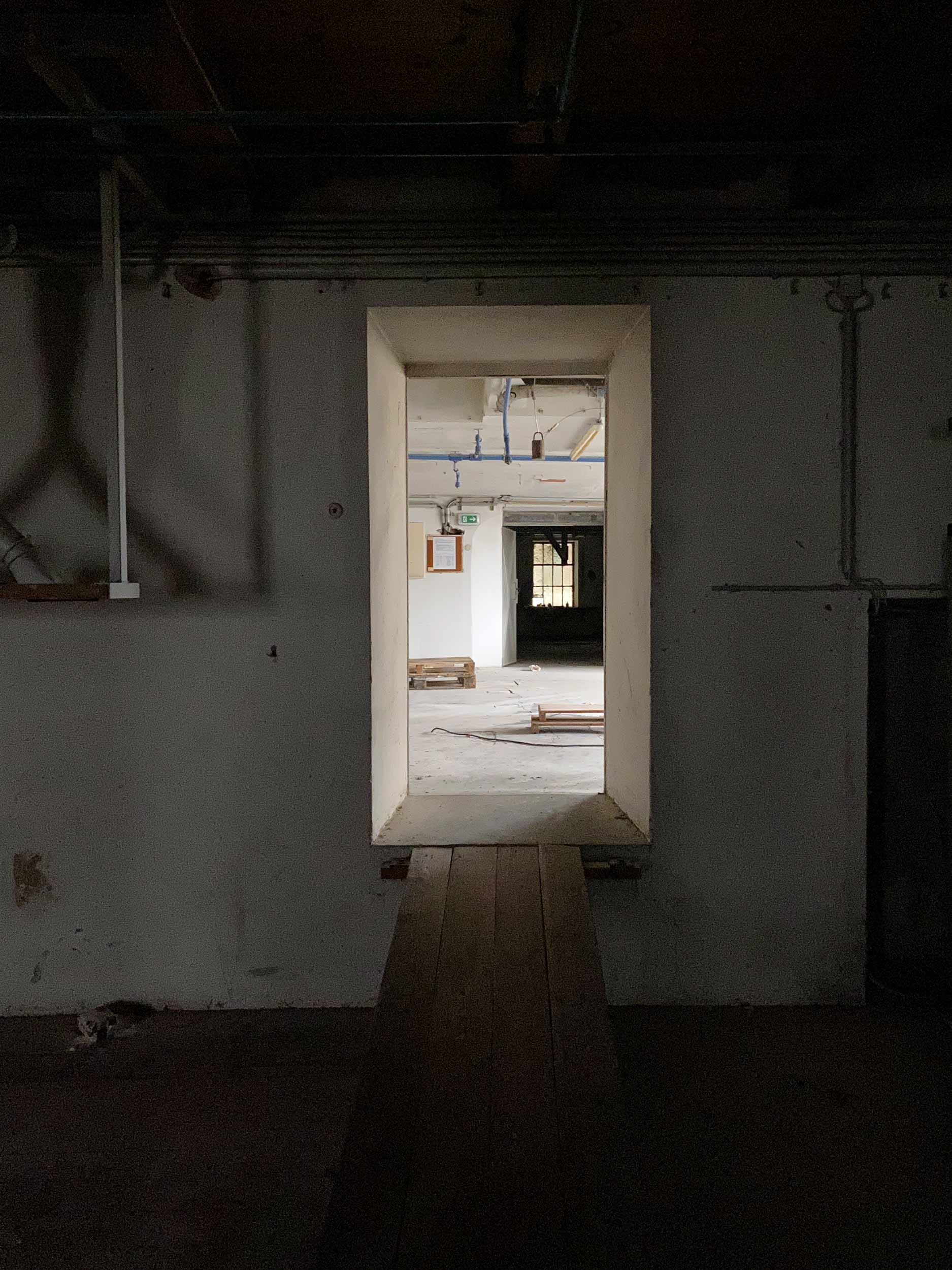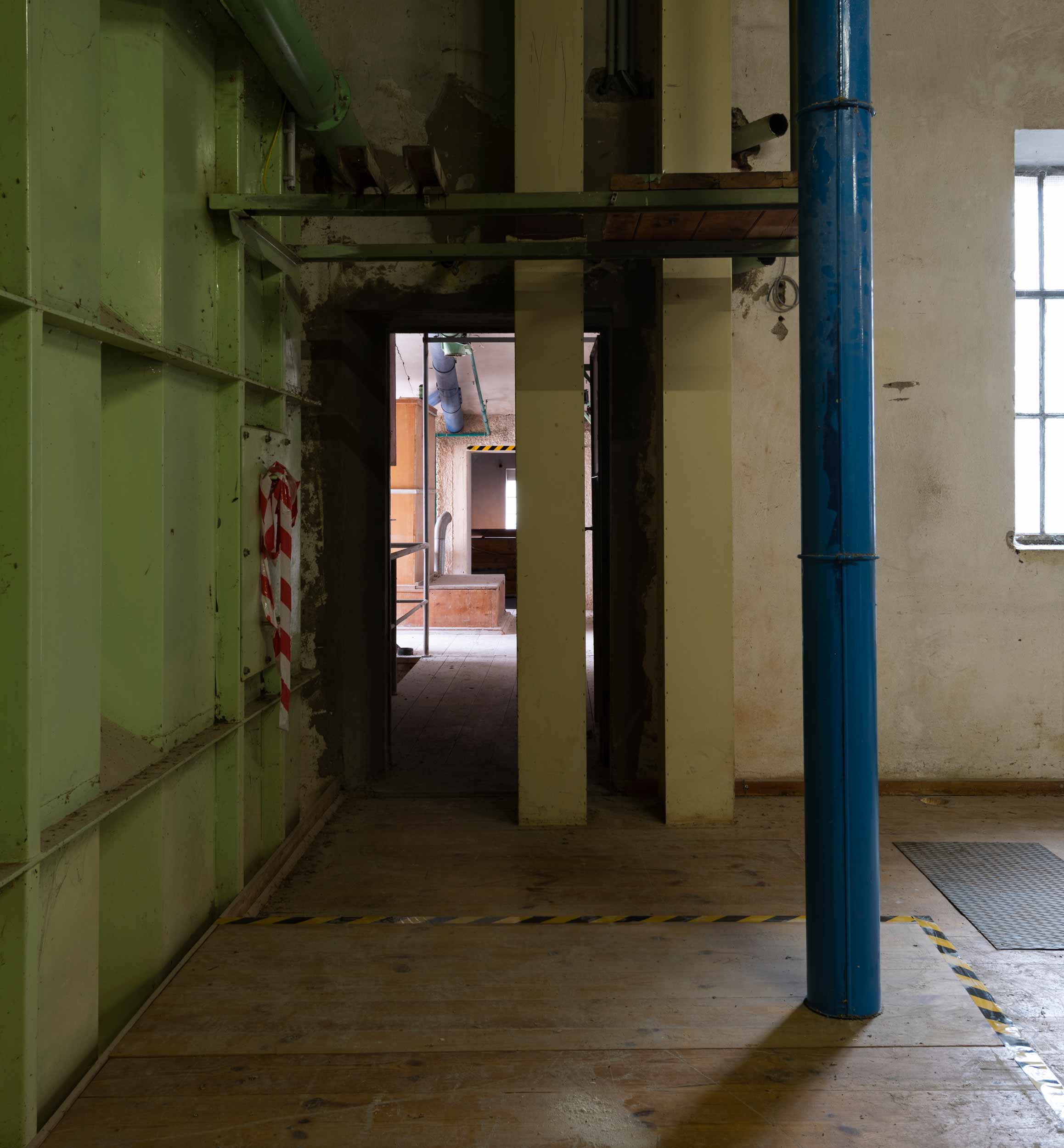 Gulaschsuppe XL, Chili con Carne und Heringsfilets in Senfsoße. Pragmatisch umfunktionierte Dosen mit verschrumpelten Zigarettenstummeln stehen in den Nischen jeder Etage des Treppenhauses der Mühle. Kabel hängen von der Decke, einiges an Kupfer fehlt bereits. Da liegt ein geplättetes Mäuseskelett auf dem staubigen Boden. Ein menschendominierter Gabelstaplermoment aus der Zeit des großen Leerräumens? Einige Räume im Wohnhaus sind wieder bewohnbar. Sie sind geleert, gesaugt und gewischt, während andere nur mehr von aufgeschichteten Müllhaufen gefüllt sind. Zwischen den zusammengeworfenen Dingen eine Matratze, auf der eine in Lei bezahlte Medikamentenpackung lag. In der letzten eingerichteten Wohnung steht zwischen einer aufgeschlagenen Bettdecke, Schuhbürsten und verkalkten Wasserhähnen eine als Kerzenteller verwendete Untertasse auf antikem Mobiliar, deren Unterseite mit einem Hakenkreuz bedruckt ist. Das Fischgrätparkett aus dem oberen Stock befindet sich in Belgien. Die Wände in der Mühle sind mit Mitteilungen und Farben dekoriert. Überall auf dem Gelände sieht man einen stummen Kampf in geflickten Zäunen und Türen. Schwarze Käfer haben den Sieg über das Untergeschoss errungen. Abgepacktes Mehl liegt vereinzelt und aufgeplatzt am Boden, dazwischen verstreute Skelette und Federbatzen von verirrten Tauben. Durch die Mehlschichten am Boden ziehen sich dünne Linien.