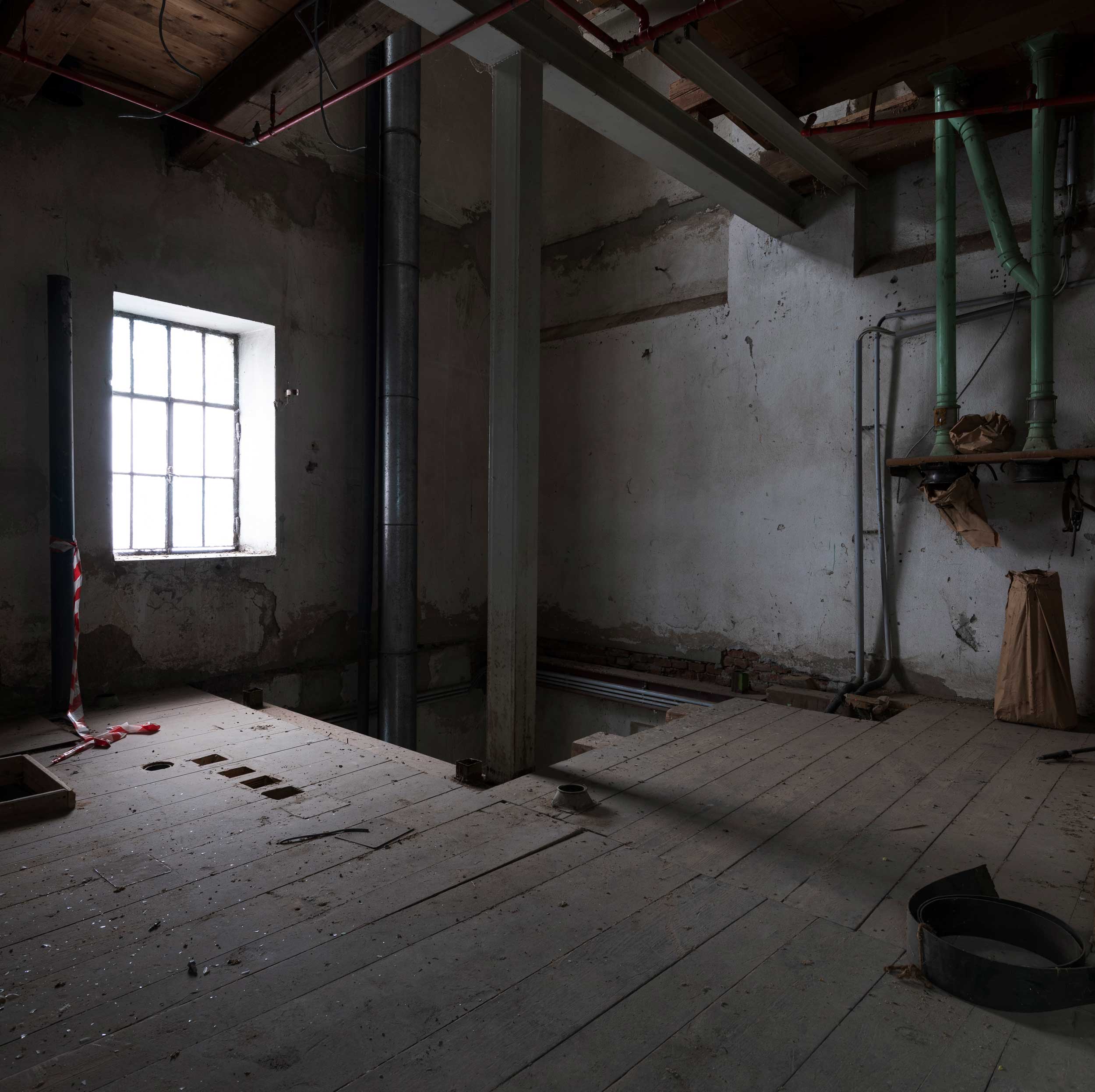 Löcher und Schrauben lassen erahnen, wo die Maschinen standen[48]. Zwischen ihnen spannte sich eine Choreografie aus Abläufen durch das gesamte Gebäude[15]. Arbeiter, Werkzeuge und Material bewegten sich in organisierten Rhythmen[73]. Physische Prozesse veränderten Konsistenzen. Dann nannte man das Korn nicht mehr Korn, sondern Mehl[27]. Dann nannte man den Arbeiter nicht mehr frisch und munter, sondern streichfähig[28]. Das Verständnis für die Organisation der Abläufe und deren Raumvolumen bildete die Grundlage der Architektur. Das Gebäude wuchs[3], um stetig eine formale Lösung für die Anforderungen der zeitgemäßen Mehlproduktion zu bieten.