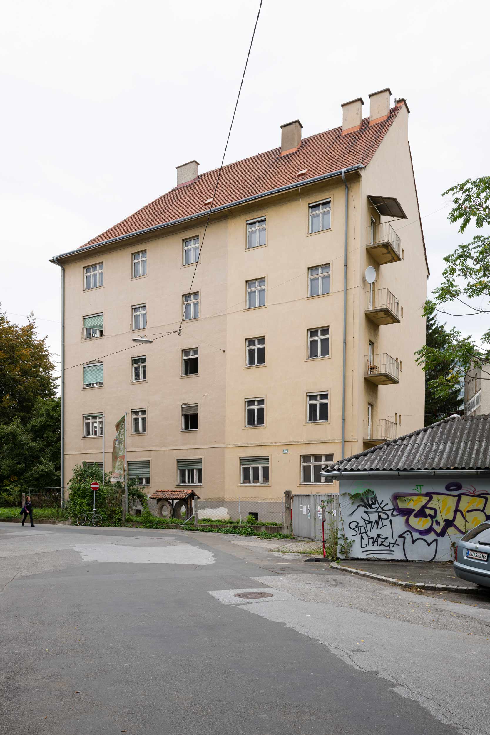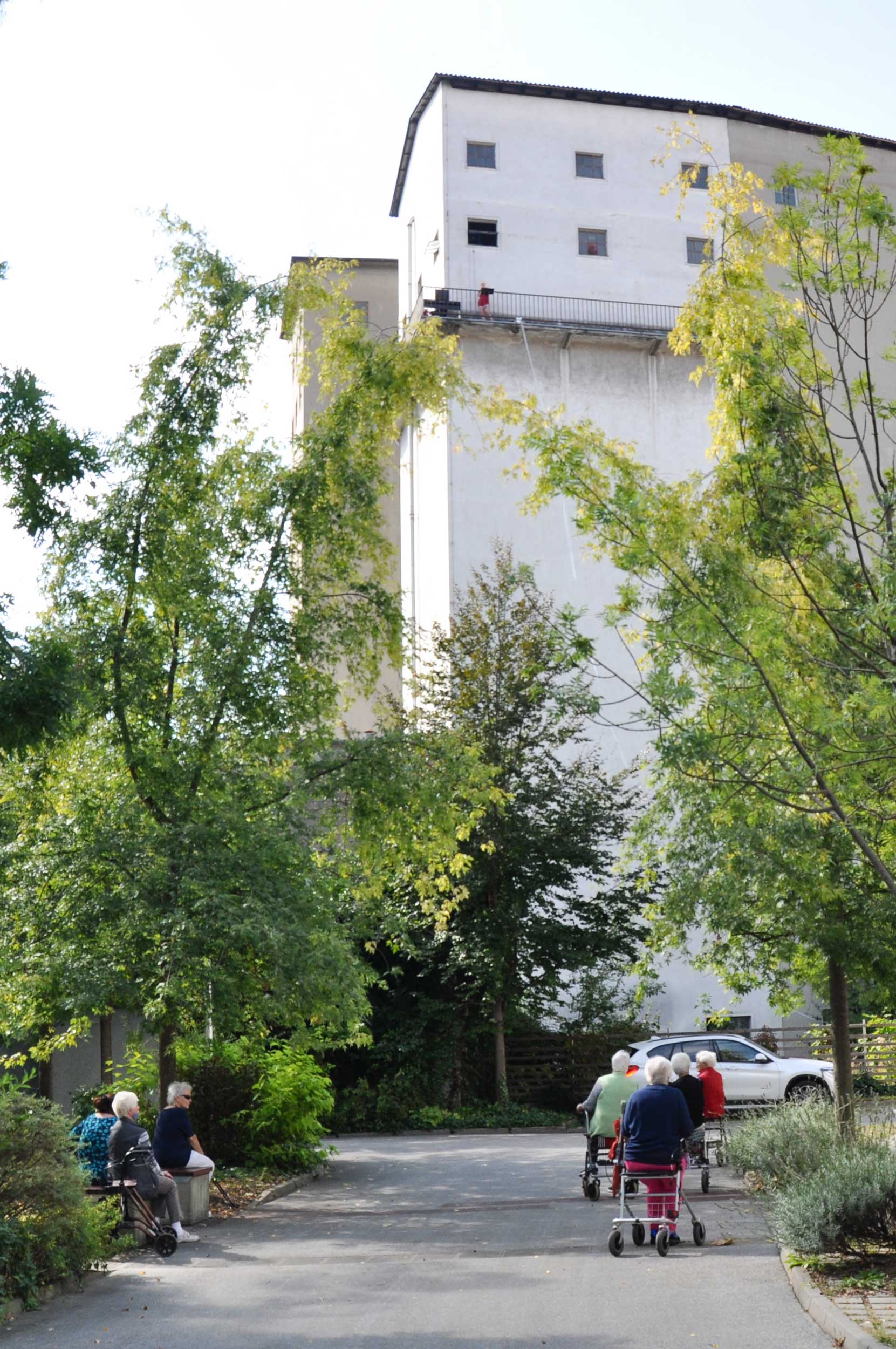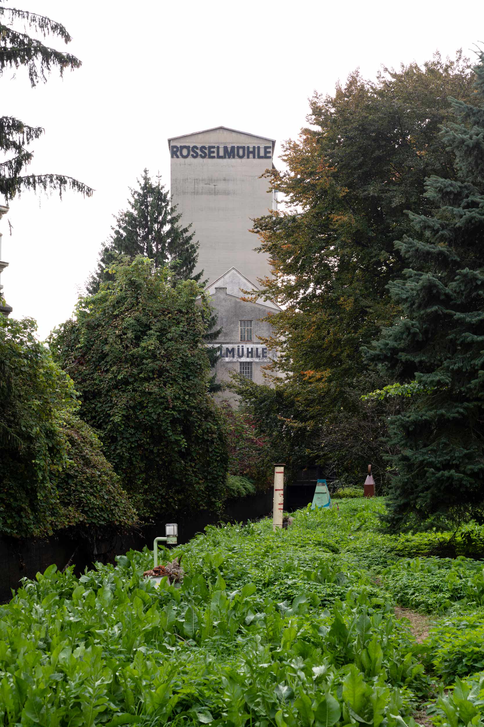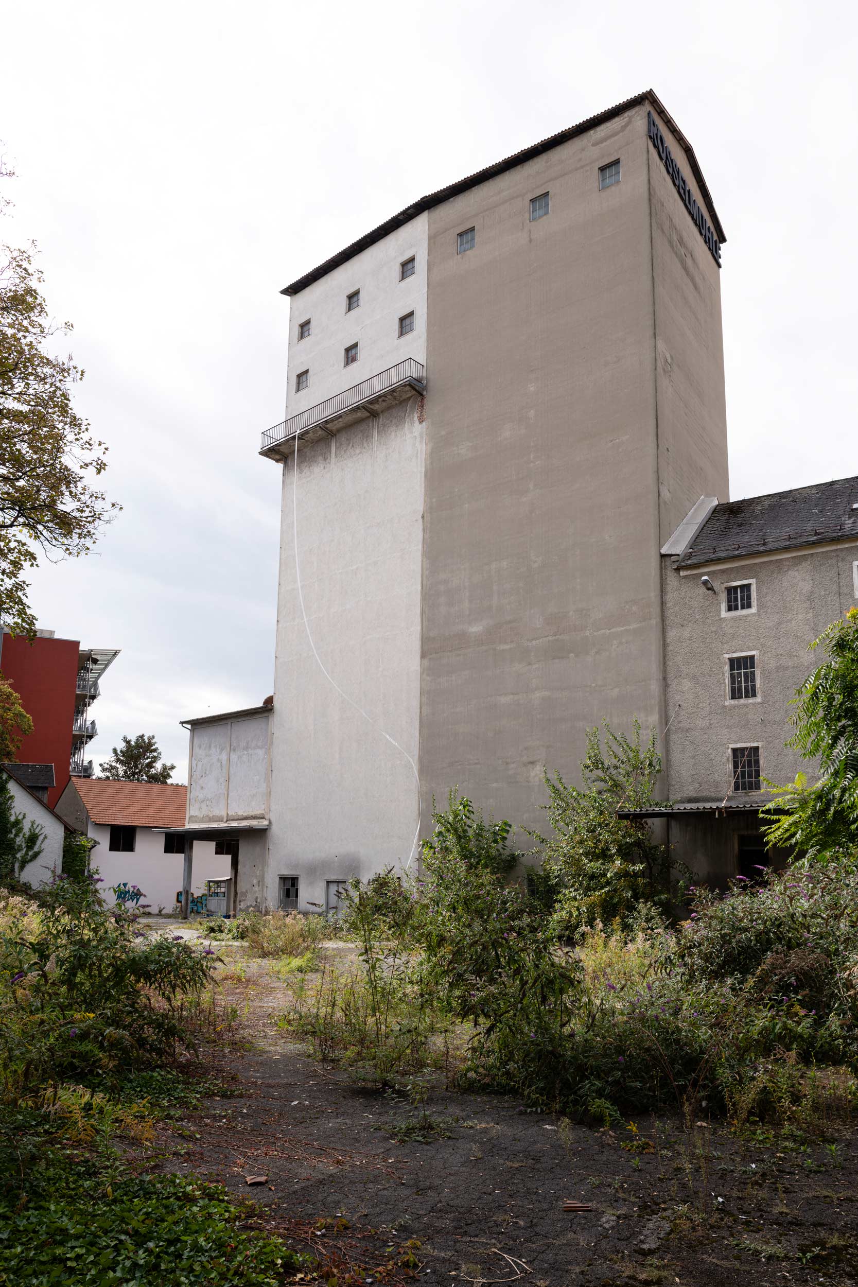 Die Mühle war noch verschlossen. Ein erster Blick fällt durch die Metallstäbe des großen Tores. Im Rücken stehen die aufgeräumten Fassaden einer Wohnsiedlung, die parkenden Autos am Straßenrand davor. Du willst dir ein Bild von dem Ort machen und versuchst das verlassene Industriegebäude zu umrunden. Du gehst die Oeverseegasse an einem Zaun entlang, der ist einige Meter geflickt, dann gepflegt. Du gehst links durch das Tor in einen Park. Vom weitläufigen, ordentlich gestalteten Oeverseepark siehst du die Türme über dichte Bäume ragen. Die Bäume schließen die Grünanlage nordöstlich hinter einer Hundezone ab und verdecken den Rest des Mühlengeländes. Eine kleine Brücke führt über den Mühlgang zum Gelände der „Geriatrischen Gesundheitszentren Graz“, der Zugang wird dir durch ein „wegen Corona“ verschlossenes Tor verwehrt. Den Radius vergrößernd ist es dir möglich, das Gelände von der anderen Seite zu betreten. Du schlängelst dich hindurch, vorbei an den Pflegewohnheimen, Tageszentren, betreuten Wohnformen sowie der Albert Schweitzer Klinik mit Wachkoma-Department, Akutgeriatrie, Remobilisation, medizinischer/palliativer Geriatrie, bis hin zum Hospiz. Durch den Zaun vor dem Hospiz spähst du in den verwilderten Hinterhof der Mühle und du siehst, den Kopf hebend, auch hier die massiven Türme emporragen. Als dann gerade ein Auto das Gelände der Kliniken verlässt, huschst du durch das sonst verschlossene Tor mit hinaus, um den Kreis um das Mühlengelände fortzusetzen. Umgenutzte Industriegebäude stehen hier; alt, massiv, aber nicht verwildert. Zur Mühle nächstgelegen der „AKDAG Supermarkt“, vor dem stetige An- und Abfahrten von Autos sowie ratternde Einkaufswägen einen Parkplatz beleben. Richtig positioniert, entdeckst du auch von hier ein Stückchen Mühle.
