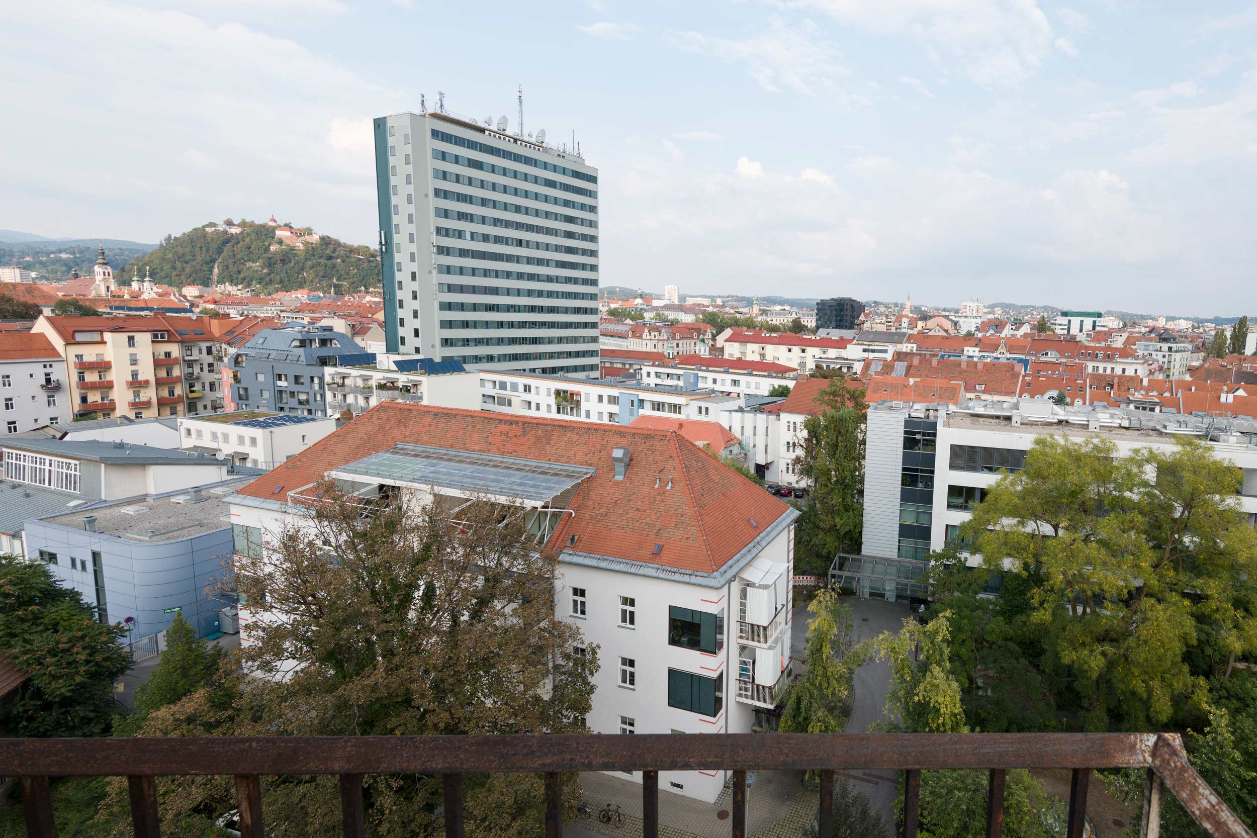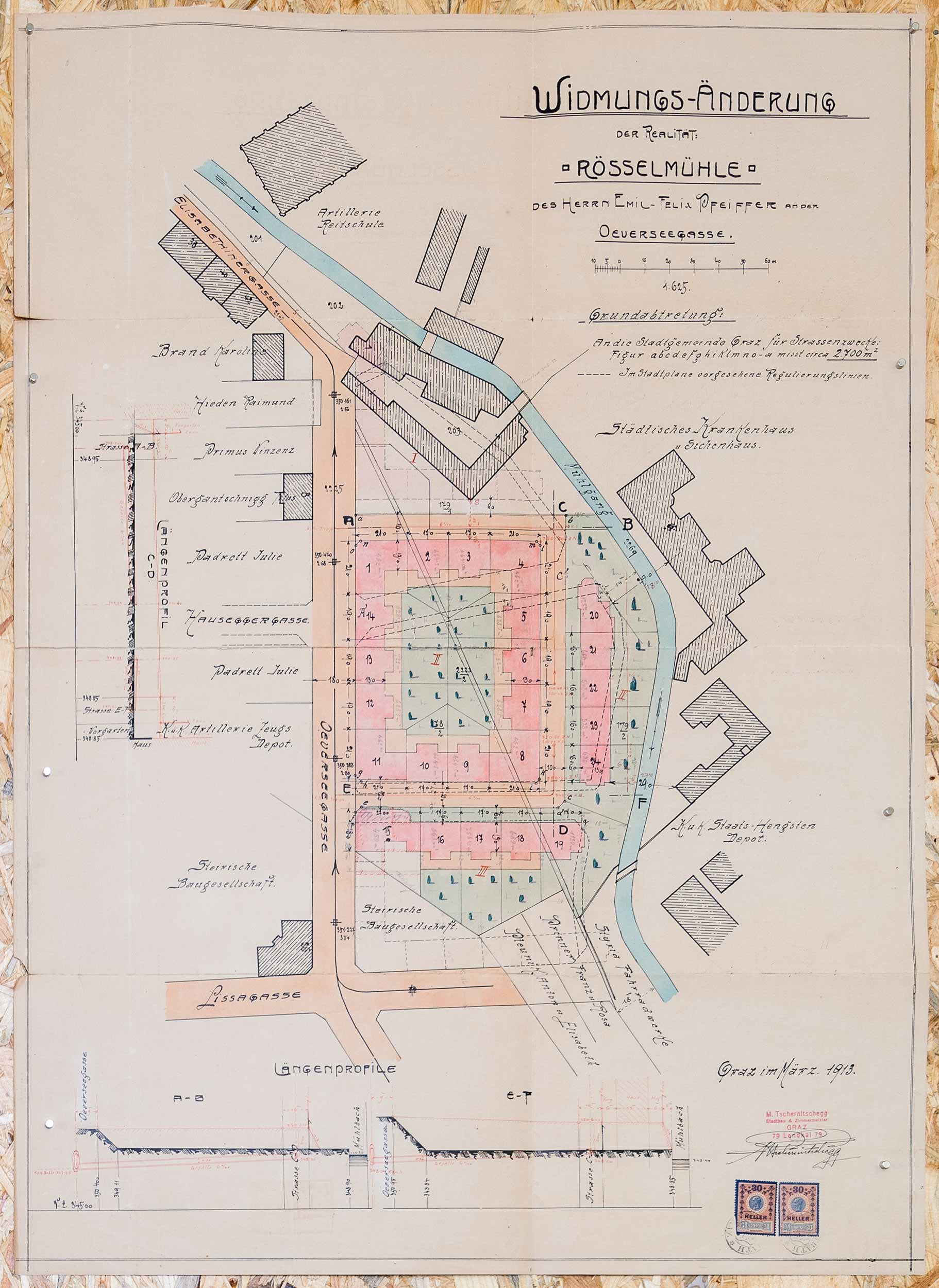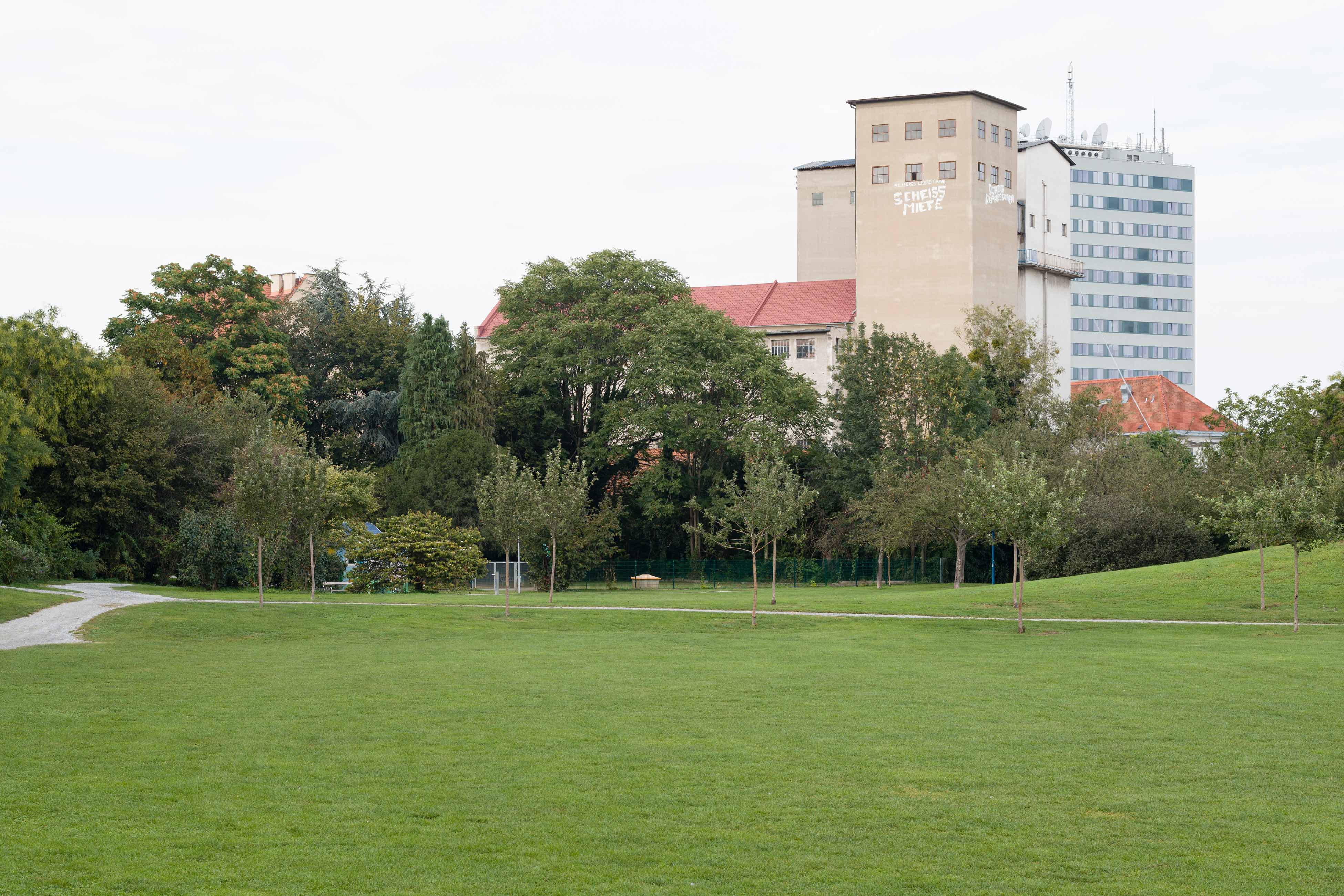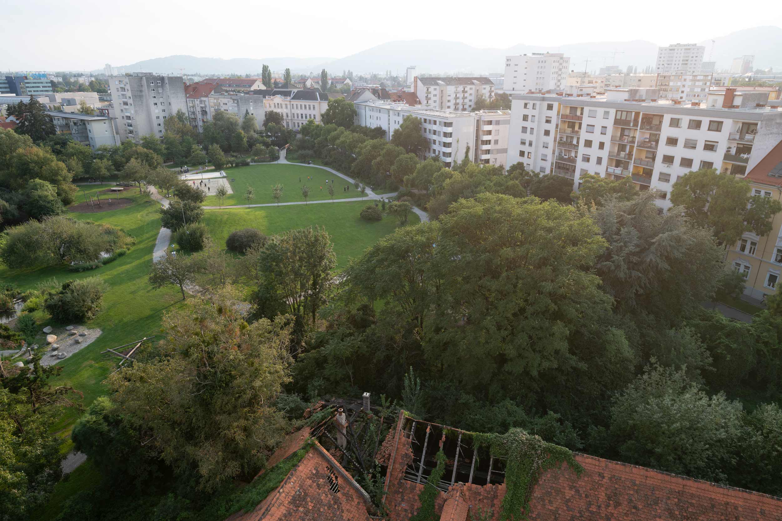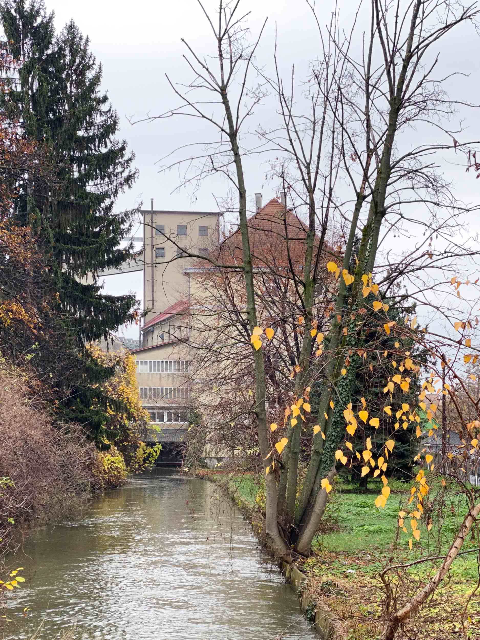 Die Mühle war noch verschlossen. Ein erster Blick fällt durch die Metallstäbe des großen Tores. Im Rücken stehen die aufgeräumten Fassaden einer Wohnsiedlung, die parkenden Autos am Straßenrand davor. Du willst dir ein Bild von dem Ort machen und versuchst das verlassene Industriegebäude zu umrunden. Du gehst die Oeverseegasse an einem Zaun entlang, der ist einige Meter geflickt, dann gepflegt. Du gehst links durch das Tor in einen Park. Vom weitläufigen, ordentlich gestalteten Oeverseepark siehst du die Türme über dichte Bäume ragen. Die Bäume schließen die Grünanlage nordöstlich hinter einer Hundezone ab und verdecken den Rest des Mühlengeländes. Eine kleine Brücke führt über den Mühlgang zum Gelände der „Geriatrischen Gesundheitszentren Graz“, der Zugang wird dir durch ein „wegen Corona“ verschlossenes Tor verwehrt. Den Radius vergrößernd ist es dir möglich, das Gelände von der anderen Seite zu betreten. Du schlängelst dich hindurch, vorbei an den Pflegewohnheimen, Tageszentren, betreuten Wohnformen sowie der Albert Schweitzer Klinik mit Wachkoma-Department, Akutgeriatrie, Remobilisation, medizinischer/palliativer Geriatrie, bis hin zum Hospiz. Durch den Zaun vor dem Hospiz spähst du in den verwilderten Hinterhof der Mühle und du siehst, den Kopf hebend, auch hier die massiven Türme emporragen. Als dann gerade ein Auto das Gelände der Kliniken verlässt, huschst du durch das sonst verschlossene Tor mit hinaus, um den Kreis um das Mühlengelände fortzusetzen. Umgenutzte Industriegebäude stehen hier; alt, massiv, aber nicht verwildert. Zur Mühle nächstgelegen der „AKDAG Supermarkt“, vor dem stetige An- und Abfahrten von Autos sowie ratternde Einkaufswägen einen Parkplatz beleben. Richtig positioniert, entdeckst du auch von hier ein Stückchen Mühle.