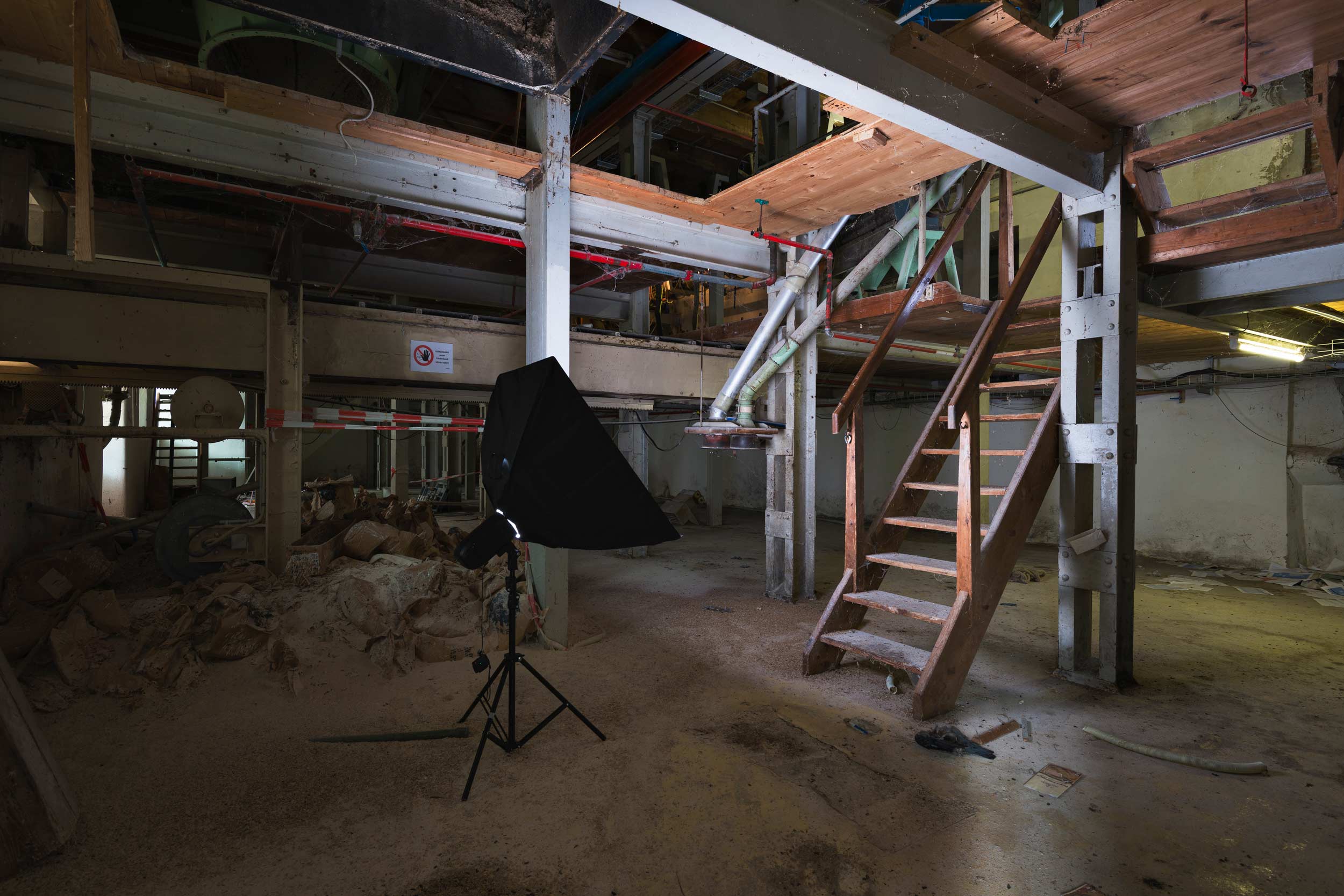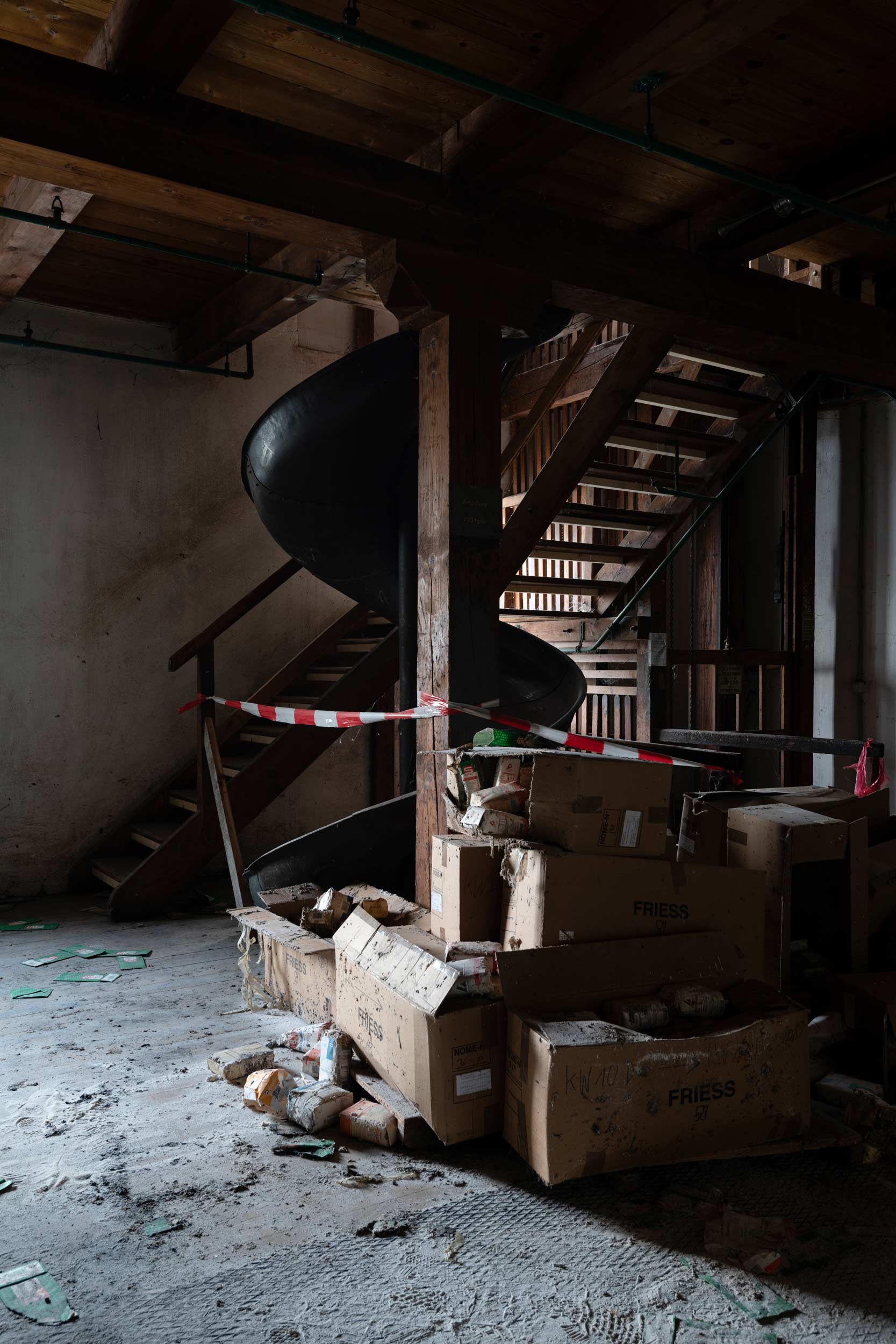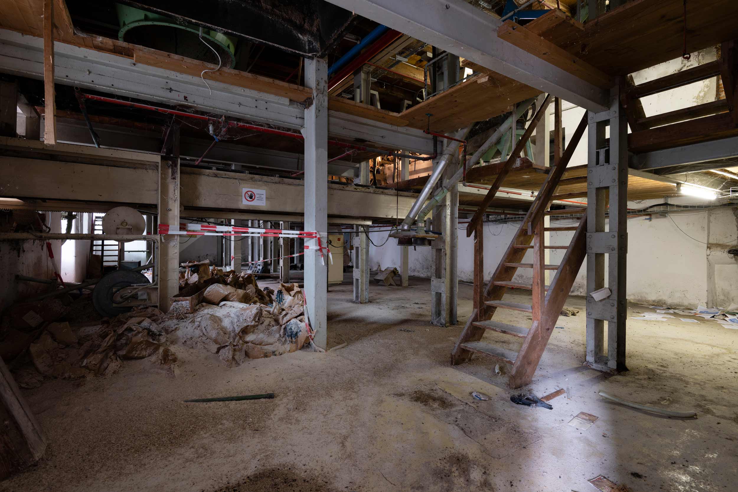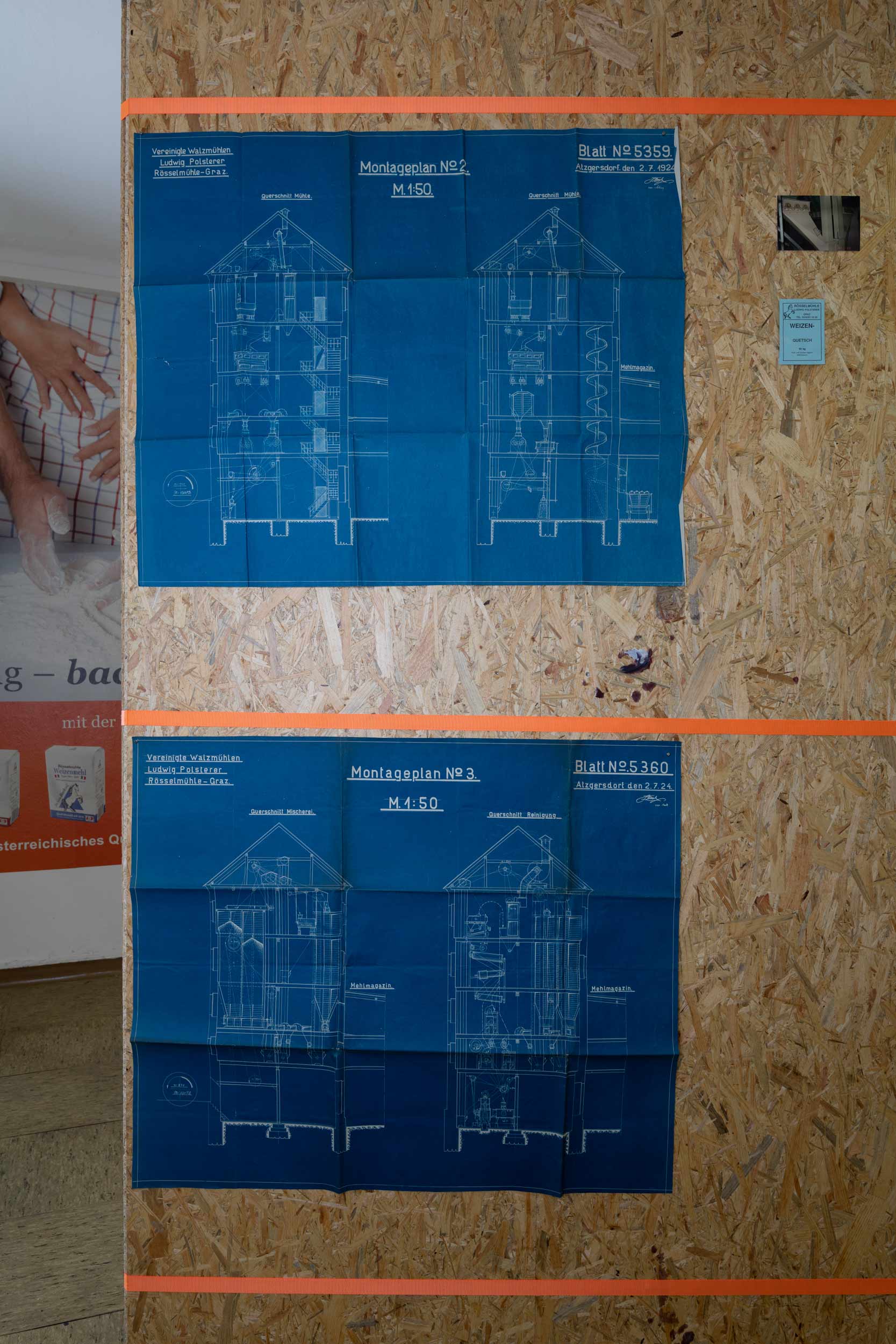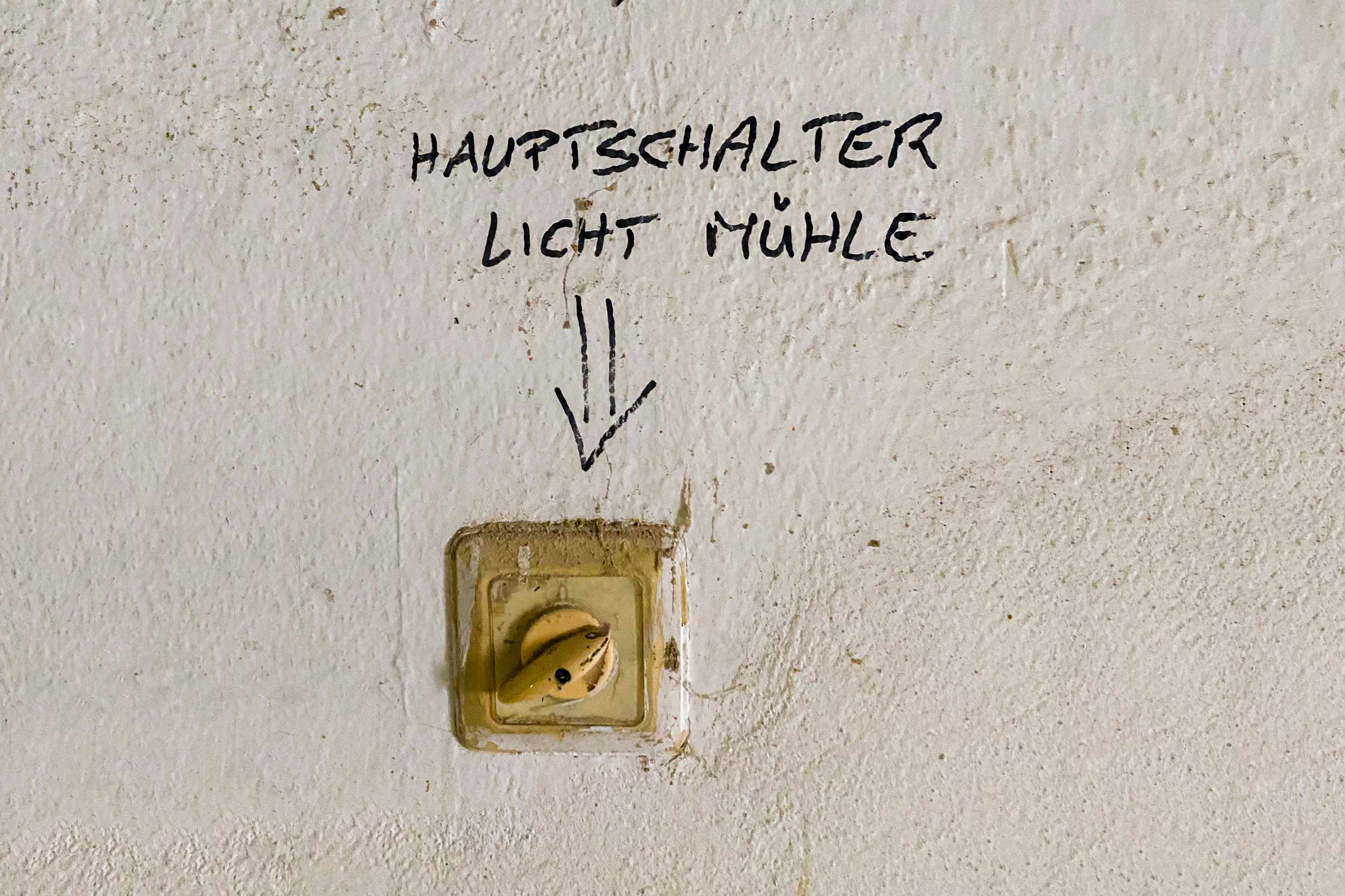 Gulaschsuppe XL, Chili con Carne und Heringsfilets in Senfsoße. Pragmatisch umfunktionierte Dosen mit verschrumpelten Zigarettenstummeln stehen in den Nischen jeder Etage des Treppenhauses der Mühle. Kabel hängen von der Decke, einiges an Kupfer fehlt bereits. Da liegt ein geplättetes Mäuseskelett auf dem staubigen Boden. Ein menschendominierter Gabelstaplermoment aus der Zeit des großen Leerräumens? Einige Räume im Wohnhaus sind wieder bewohnbar. Sie sind geleert, gesaugt und gewischt, während andere nur mehr von aufgeschichteten Müllhaufen gefüllt sind. Zwischen den zusammengeworfenen Dingen eine Matratze, auf der eine in Lei bezahlte Medikamentenpackung lag. In der letzten eingerichteten Wohnung steht zwischen einer aufgeschlagenen Bettdecke, Schuhbürsten und verkalkten Wasserhähnen eine als Kerzenteller verwendete Untertasse auf antikem Mobiliar, deren Unterseite mit einem Hakenkreuz bedruckt ist. Das Fischgrätparkett aus dem oberen Stock befindet sich in Belgien. Die Wände in der Mühle sind mit Mitteilungen und Farben dekoriert. Überall auf dem Gelände sieht man einen stummen Kampf in geflickten Zäunen und Türen. Schwarze Käfer haben den Sieg über das Untergeschoss errungen. Abgepacktes Mehl liegt vereinzelt und aufgeplatzt am Boden, dazwischen verstreute Skelette und Federbatzen von verirrten Tauben. Durch die Mehlschichten am Boden ziehen sich dünne Linien.