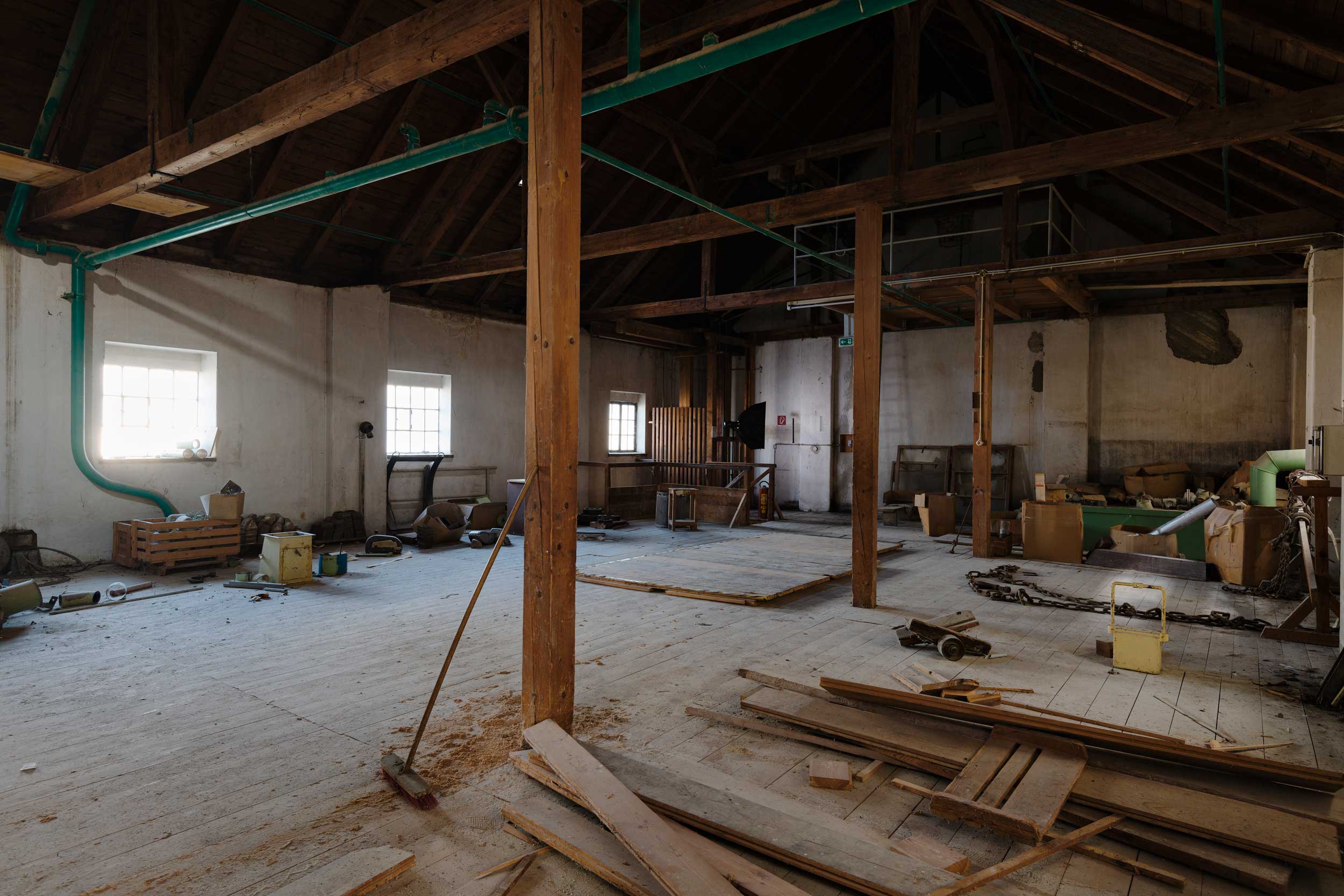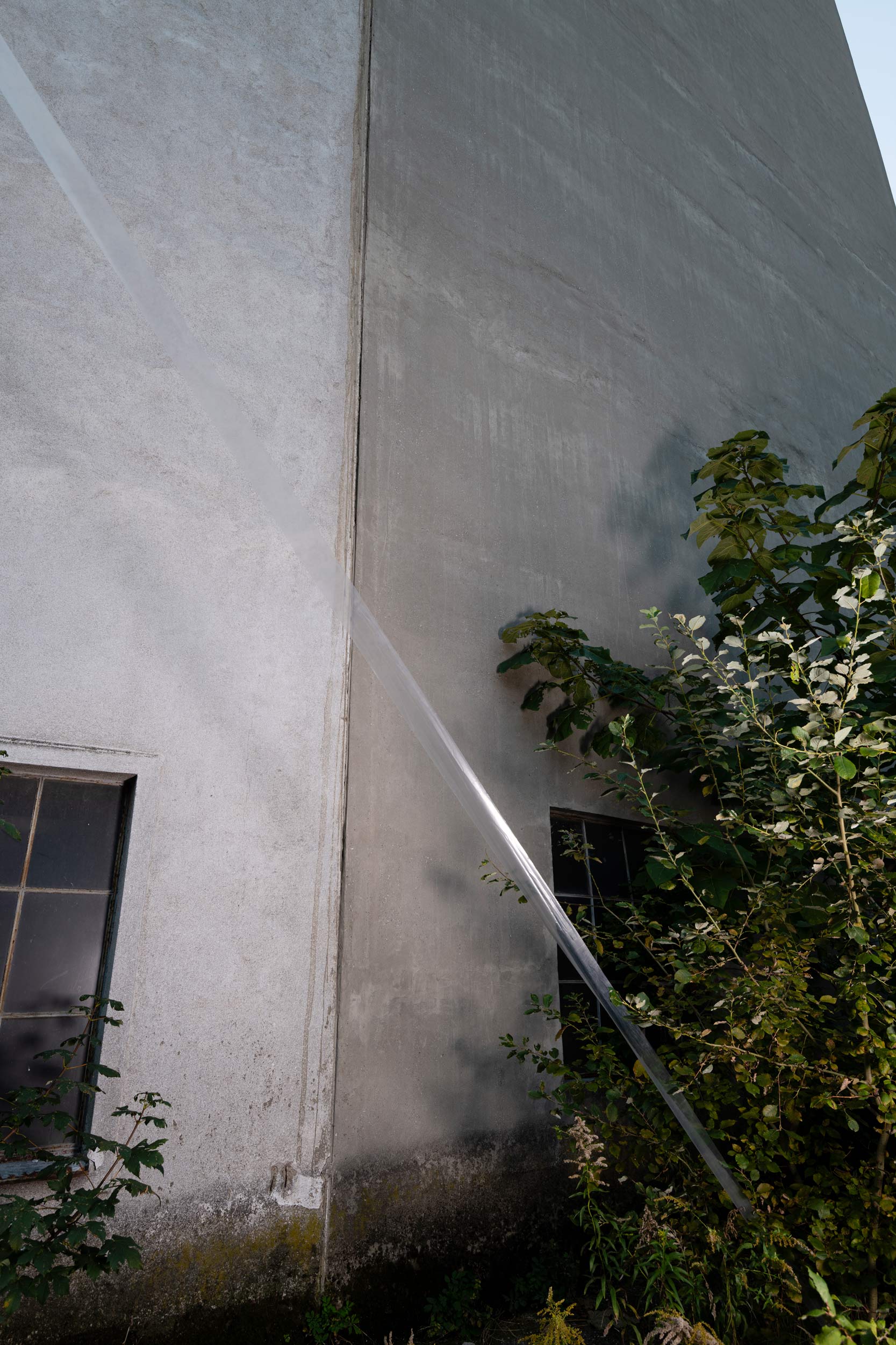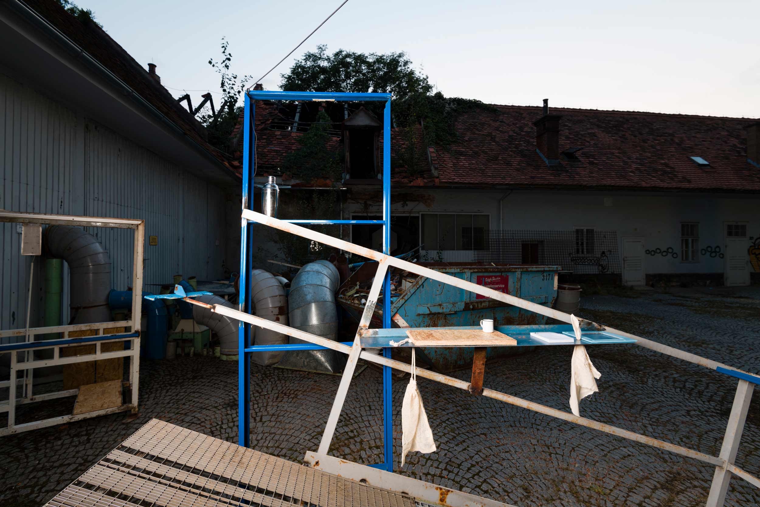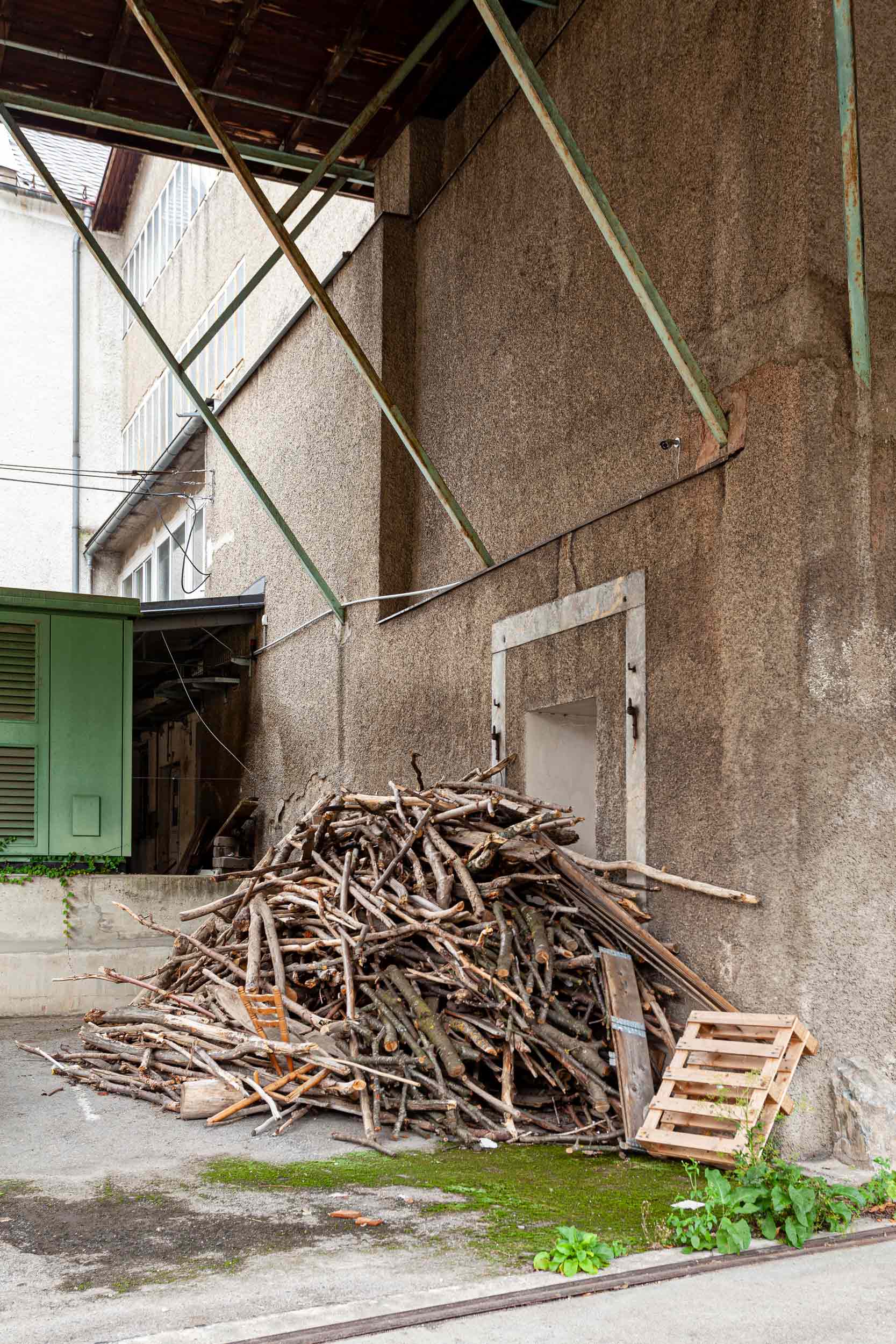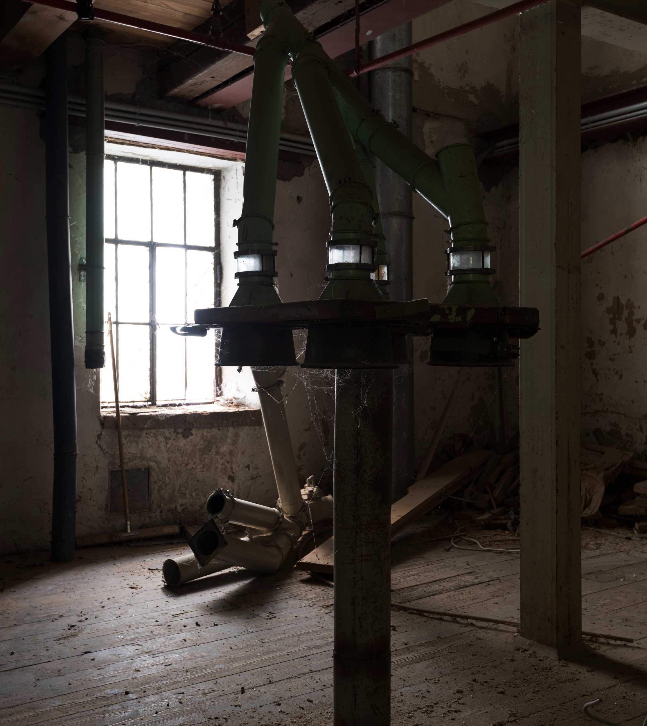 Gulaschsuppe XL, Chili con Carne und Heringsfilets in Senfsoße. Pragmatisch umfunktionierte Dosen mit verschrumpelten Zigarettenstummeln stehen in den Nischen jeder Etage des Treppenhauses der Mühle. Kabel hängen von der Decke, einiges an Kupfer fehlt bereits. Da liegt ein geplättetes Mäuseskelett auf dem staubigen Boden. Ein menschendominierter Gabelstaplermoment aus der Zeit des großen Leerräumens? Einige Räume im Wohnhaus sind wieder bewohnbar. Sie sind geleert, gesaugt und gewischt, während andere nur mehr von aufgeschichteten Müllhaufen gefüllt sind. Zwischen den zusammengeworfenen Dingen eine Matratze, auf der eine in Lei bezahlte Medikamentenpackung lag. In der letzten eingerichteten Wohnung steht zwischen einer aufgeschlagenen Bettdecke, Schuhbürsten und verkalkten Wasserhähnen eine als Kerzenteller verwendete Untertasse auf antikem Mobiliar, deren Unterseite mit einem Hakenkreuz bedruckt ist. Das Fischgrätparkett aus dem oberen Stock befindet sich in Belgien. Die Wände in der Mühle sind mit Mitteilungen und Farben dekoriert. Überall auf dem Gelände sieht man einen stummen Kampf in geflickten Zäunen und Türen. Schwarze Käfer haben den Sieg über das Untergeschoss errungen. Abgepacktes Mehl liegt vereinzelt und aufgeplatzt am Boden, dazwischen verstreute Skelette und Federbatzen von verirrten Tauben. Durch die Mehlschichten am Boden ziehen sich dünne Linien.