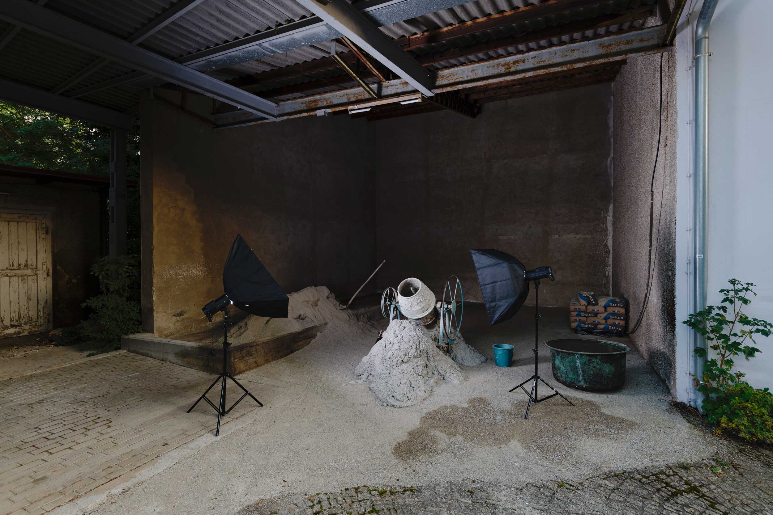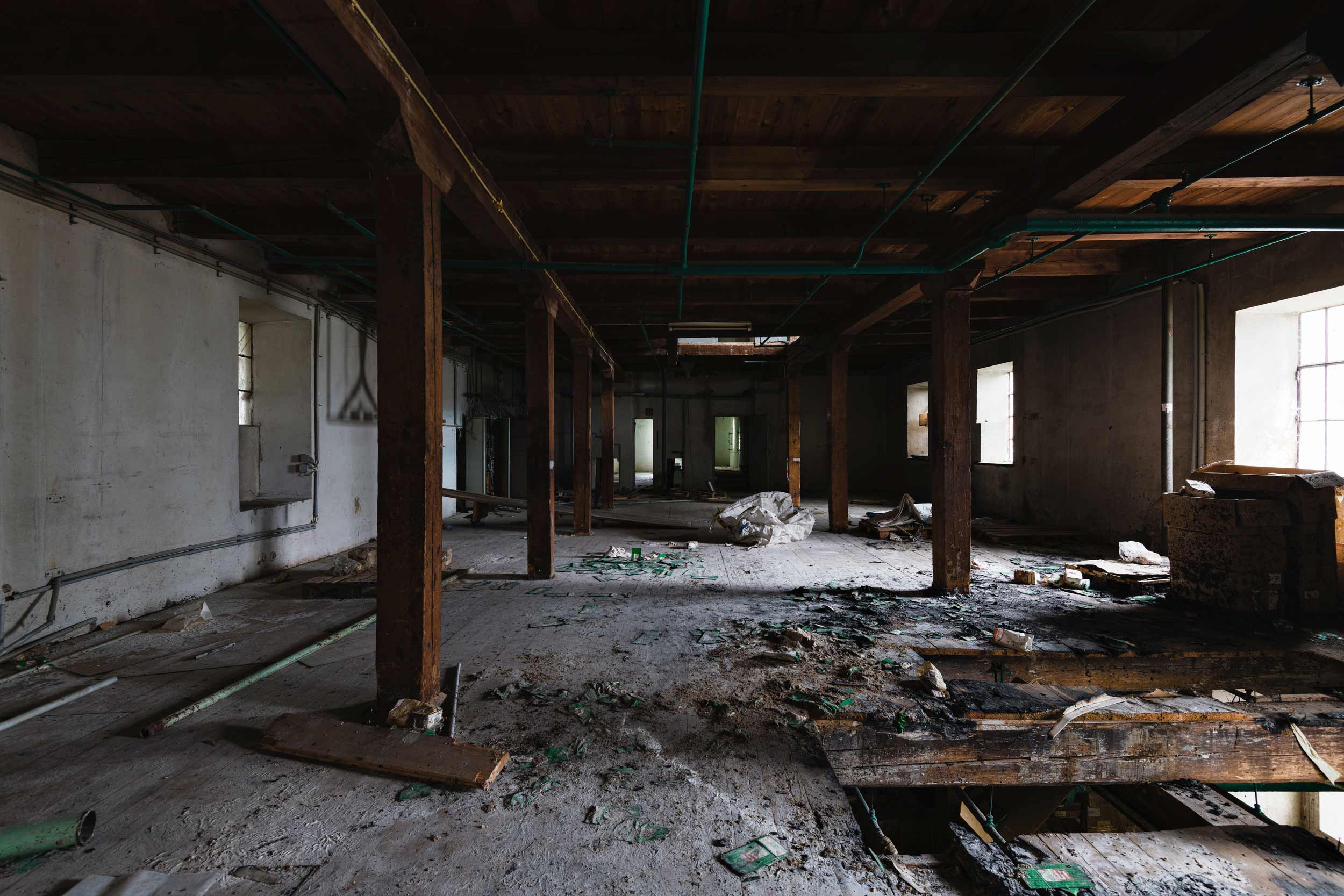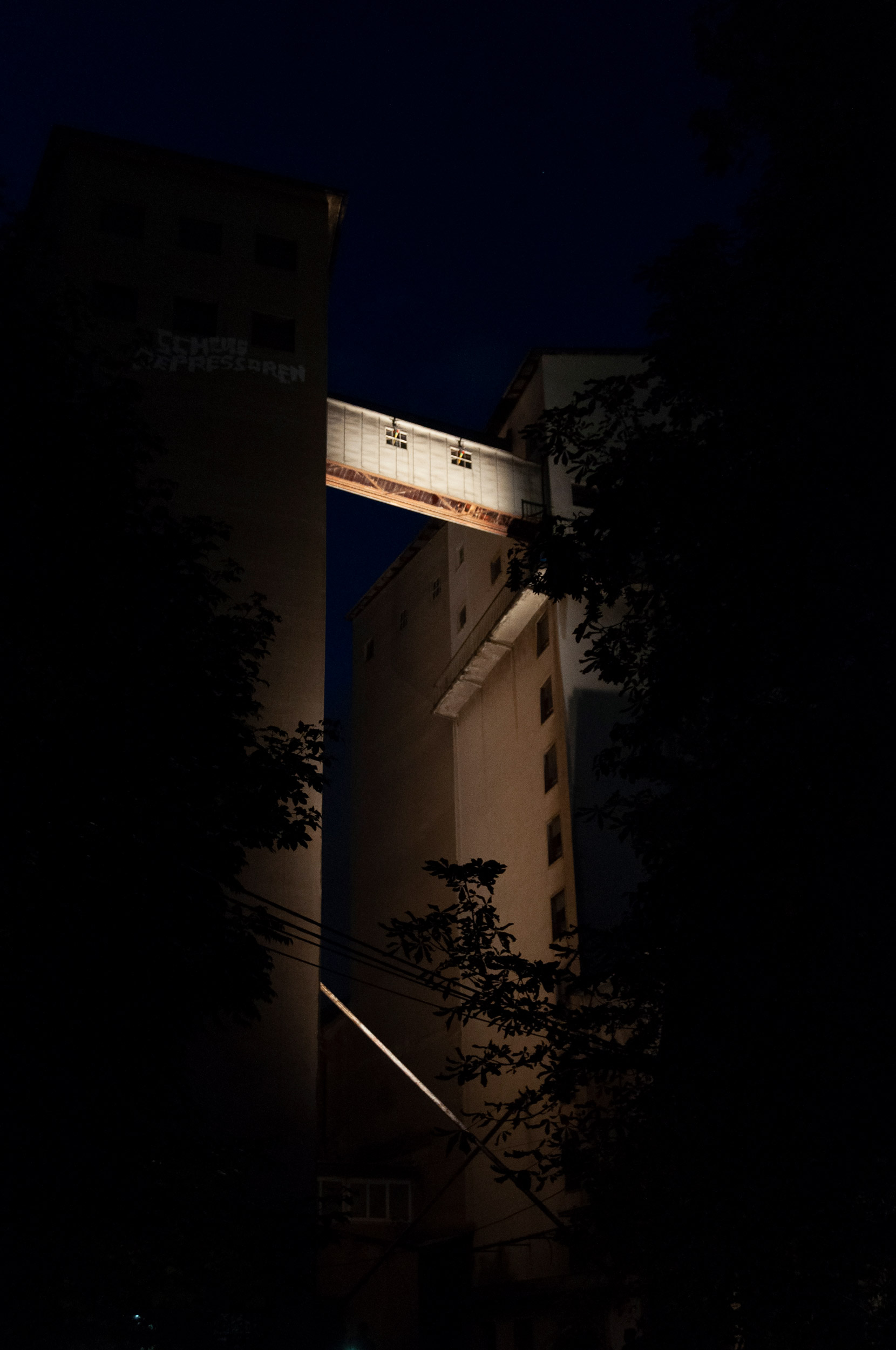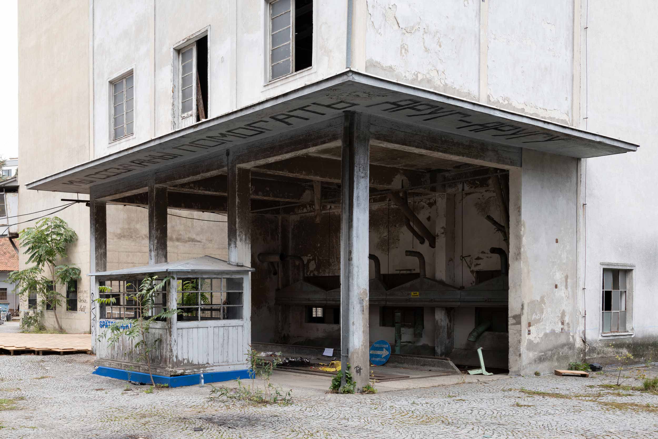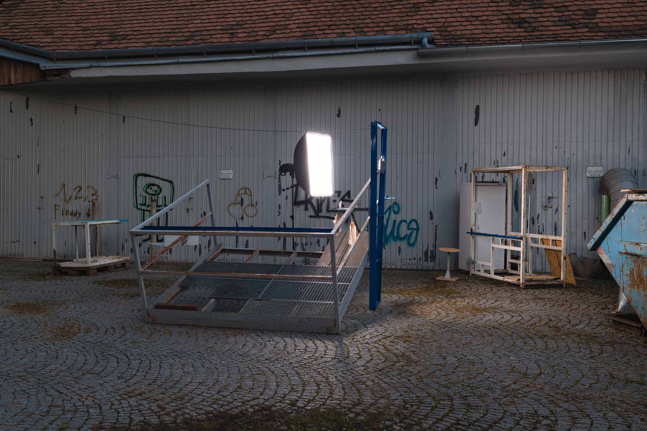 Gulaschsuppe XL, Chili con Carne und Heringsfilets in Senfsoße. Pragmatisch umfunktionierte Dosen mit verschrumpelten Zigarettenstummeln stehen in den Nischen jeder Etage des Treppenhauses der Mühle. Kabel hängen von der Decke, einiges an Kupfer fehlt bereits. Da liegt ein geplättetes Mäuseskelett auf dem staubigen Boden. Ein menschendominierter Gabelstaplermoment aus der Zeit des großen Leerräumens? Einige Räume im Wohnhaus sind wieder bewohnbar. Sie sind geleert, gesaugt und gewischt, während andere nur mehr von aufgeschichteten Müllhaufen gefüllt sind. Zwischen den zusammengeworfenen Dingen eine Matratze, auf der eine in Lei bezahlte Medikamentenpackung lag. In der letzten eingerichteten Wohnung steht zwischen einer aufgeschlagenen Bettdecke, Schuhbürsten und verkalkten Wasserhähnen eine als Kerzenteller verwendete Untertasse auf antikem Mobiliar, deren Unterseite mit einem Hakenkreuz bedruckt ist. Das Fischgrätparkett aus dem oberen Stock befindet sich in Belgien. Die Wände in der Mühle sind mit Mitteilungen und Farben dekoriert. Überall auf dem Gelände sieht man einen stummen Kampf in geflickten Zäunen und Türen. Schwarze Käfer haben den Sieg über das Untergeschoss errungen. Abgepacktes Mehl liegt vereinzelt und aufgeplatzt am Boden, dazwischen verstreute Skelette und Federbatzen von verirrten Tauben. Durch die Mehlschichten am Boden ziehen sich dünne Linien.