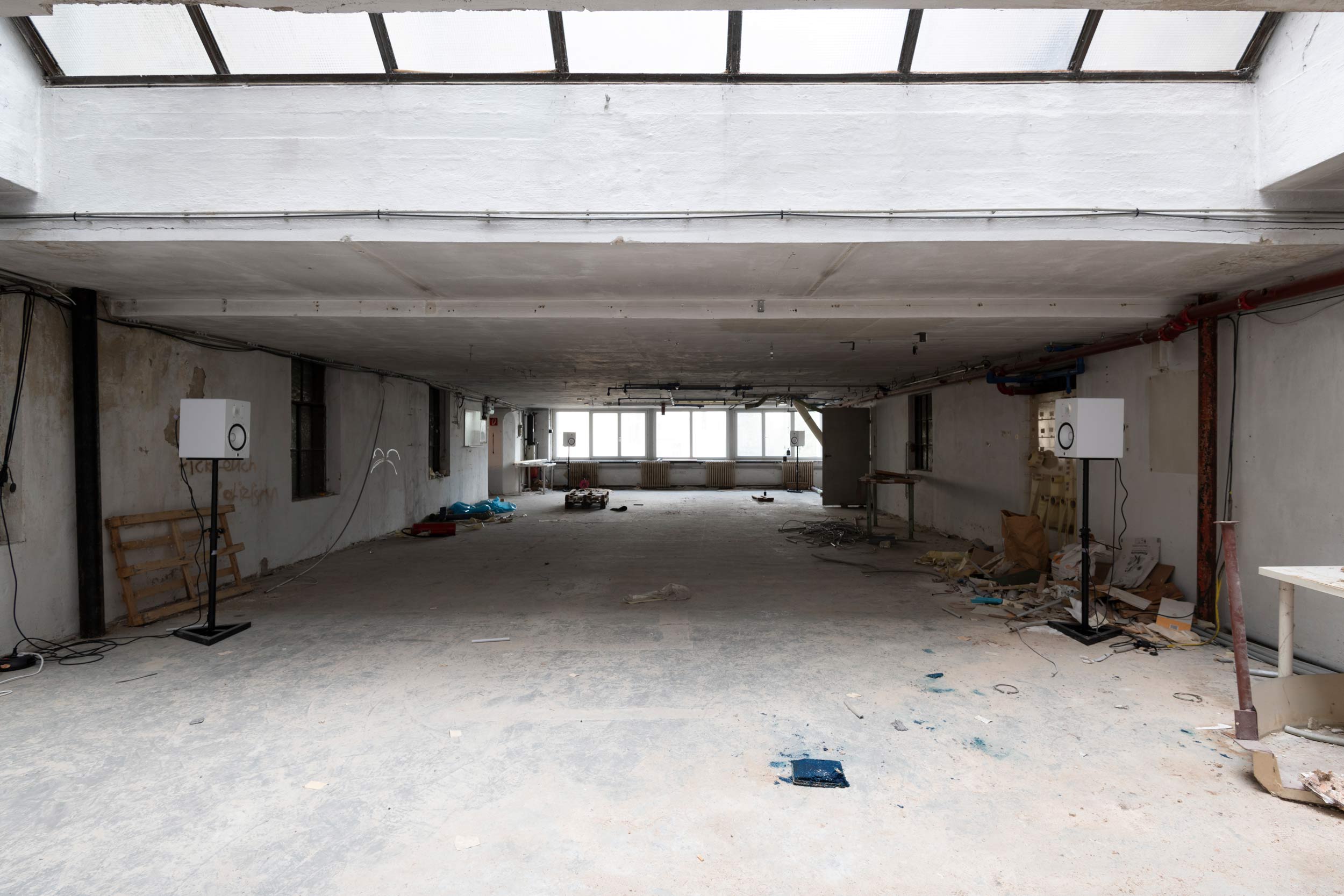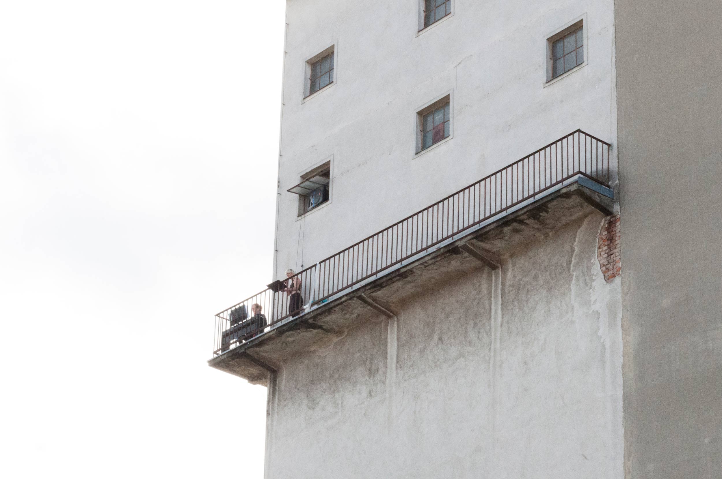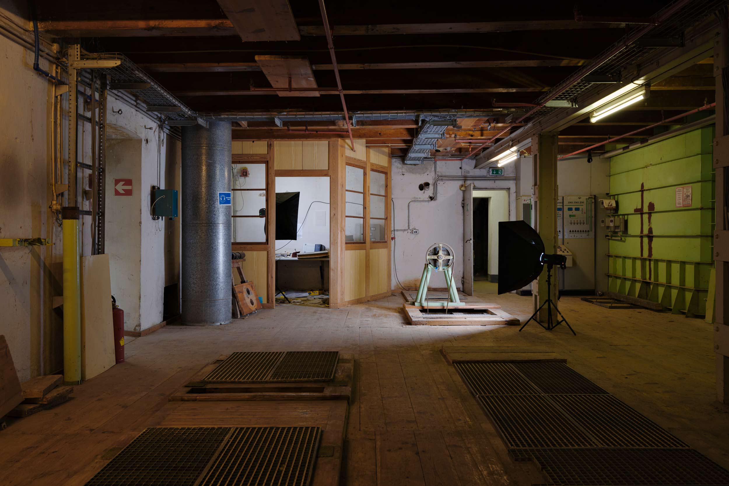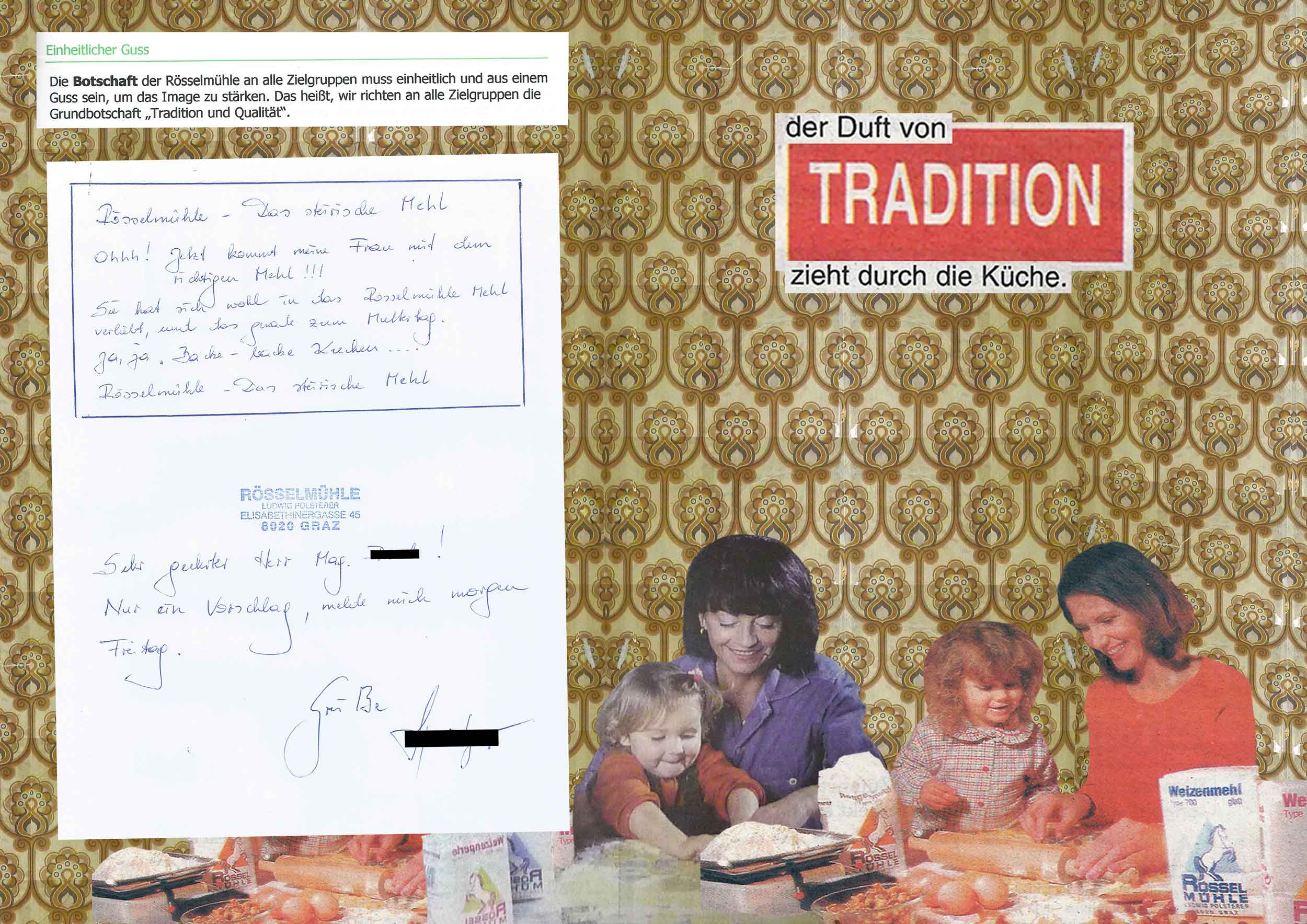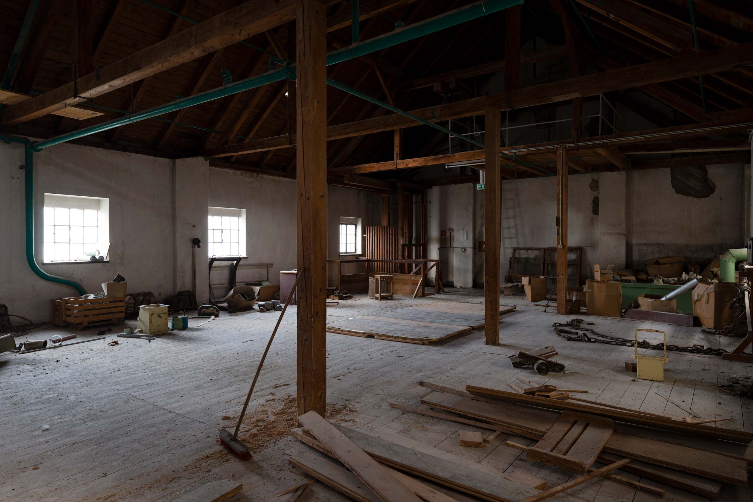 Gulaschsuppe XL, Chili con Carne und Heringsfilets in Senfsoße. Pragmatisch umfunktionierte Dosen mit verschrumpelten Zigarettenstummeln stehen in den Nischen jeder Etage des Treppenhauses der Mühle. Kabel hängen von der Decke, einiges an Kupfer fehlt bereits. Da liegt ein geplättetes Mäuseskelett auf dem staubigen Boden. Ein menschendominierter Gabelstaplermoment aus der Zeit des großen Leerräumens? Einige Räume im Wohnhaus sind wieder bewohnbar. Sie sind geleert, gesaugt und gewischt, während andere nur mehr von aufgeschichteten Müllhaufen gefüllt sind. Zwischen den zusammengeworfenen Dingen eine Matratze, auf der eine in Lei bezahlte Medikamentenpackung lag. In der letzten eingerichteten Wohnung steht zwischen einer aufgeschlagenen Bettdecke, Schuhbürsten und verkalkten Wasserhähnen eine als Kerzenteller verwendete Untertasse auf antikem Mobiliar, deren Unterseite mit einem Hakenkreuz bedruckt ist. Das Fischgrätparkett aus dem oberen Stock befindet sich in Belgien. Die Wände in der Mühle sind mit Mitteilungen und Farben dekoriert. Überall auf dem Gelände sieht man einen stummen Kampf in geflickten Zäunen und Türen. Schwarze Käfer haben den Sieg über das Untergeschoss errungen. Abgepacktes Mehl liegt vereinzelt und aufgeplatzt am Boden, dazwischen verstreute Skelette und Federbatzen von verirrten Tauben. Durch die Mehlschichten am Boden ziehen sich dünne Linien.