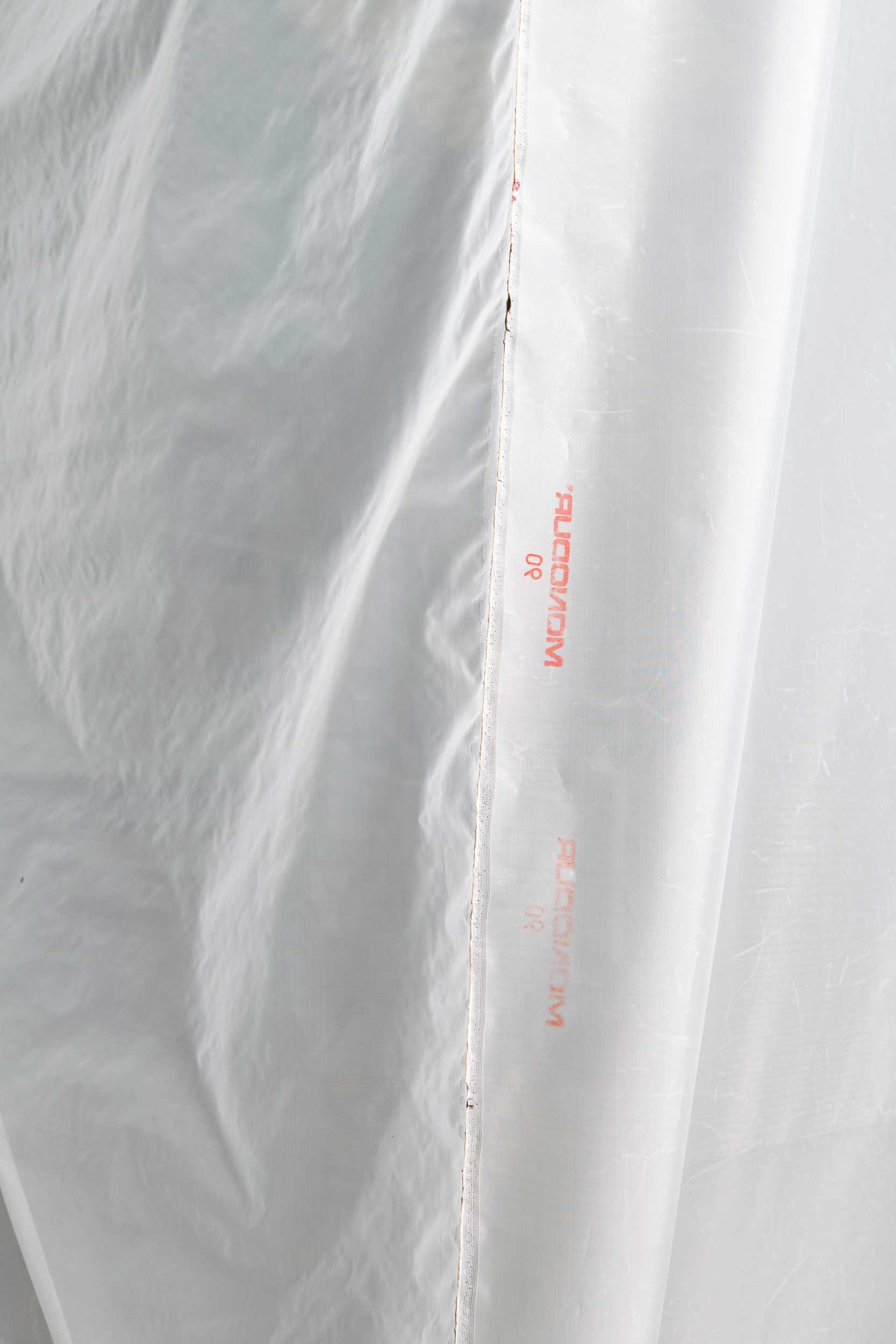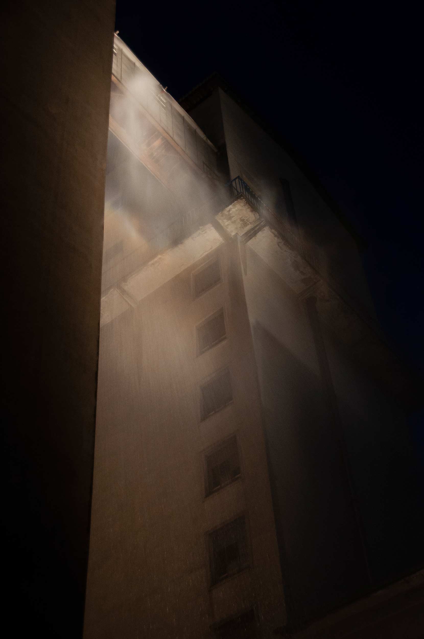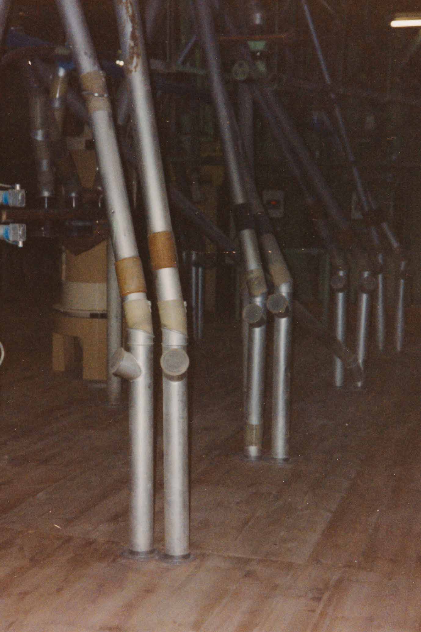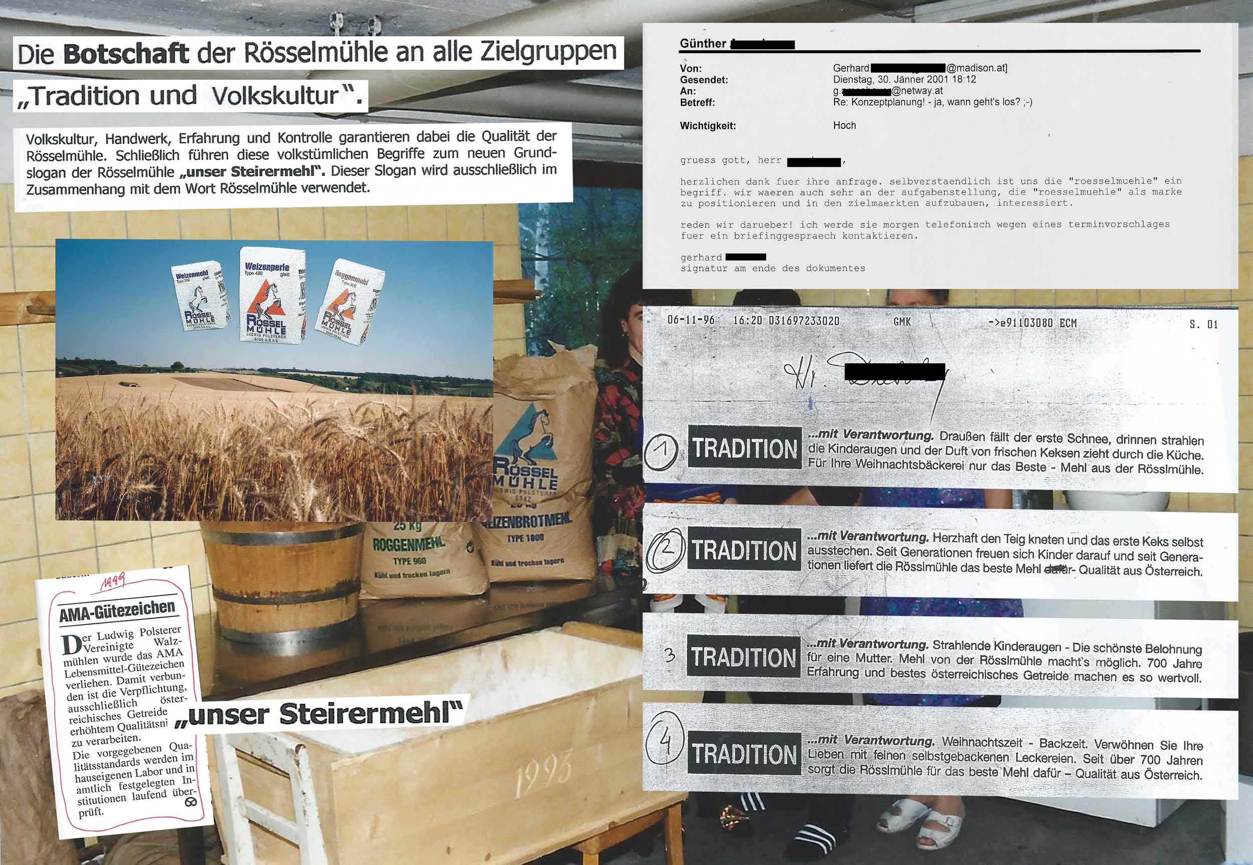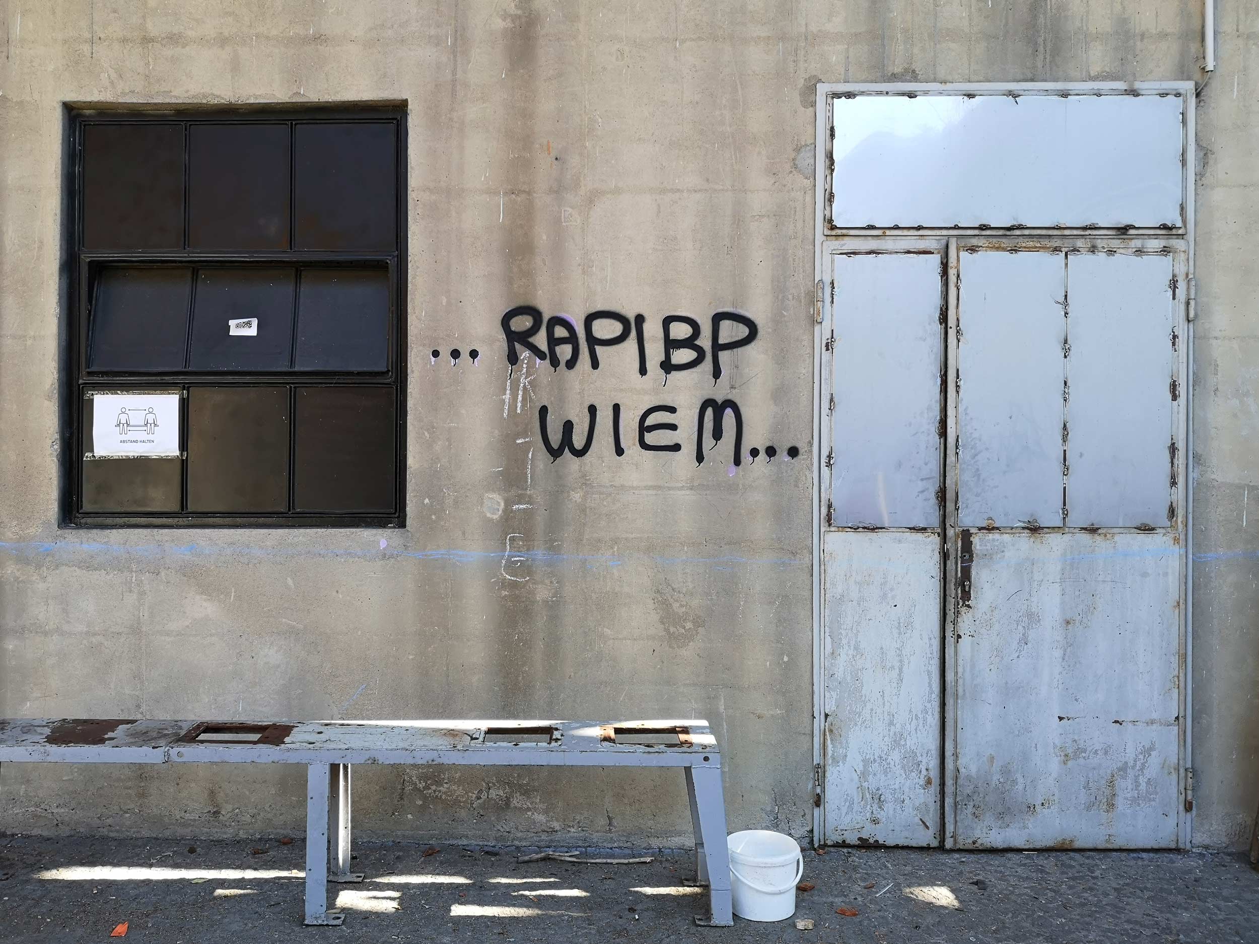 Gulaschsuppe XL, Chili con Carne und Heringsfilets in Senfsoße. Pragmatisch umfunktionierte Dosen mit verschrumpelten Zigarettenstummeln stehen in den Nischen jeder Etage des Treppenhauses der Mühle. Kabel hängen von der Decke, einiges an Kupfer fehlt bereits. Da liegt ein geplättetes Mäuseskelett auf dem staubigen Boden. Ein menschendominierter Gabelstaplermoment aus der Zeit des großen Leerräumens? Einige Räume im Wohnhaus sind wieder bewohnbar. Sie sind geleert, gesaugt und gewischt, während andere nur mehr von aufgeschichteten Müllhaufen gefüllt sind. Zwischen den zusammengeworfenen Dingen eine Matratze, auf der eine in Lei bezahlte Medikamentenpackung lag. In der letzten eingerichteten Wohnung steht zwischen einer aufgeschlagenen Bettdecke, Schuhbürsten und verkalkten Wasserhähnen eine als Kerzenteller verwendete Untertasse auf antikem Mobiliar, deren Unterseite mit einem Hakenkreuz bedruckt ist. Das Fischgrätparkett aus dem oberen Stock befindet sich in Belgien. Die Wände in der Mühle sind mit Mitteilungen und Farben dekoriert. Überall auf dem Gelände sieht man einen stummen Kampf in geflickten Zäunen und Türen. Schwarze Käfer haben den Sieg über das Untergeschoss errungen. Abgepacktes Mehl liegt vereinzelt und aufgeplatzt am Boden, dazwischen verstreute Skelette und Federbatzen von verirrten Tauben. Durch die Mehlschichten am Boden ziehen sich dünne Linien.