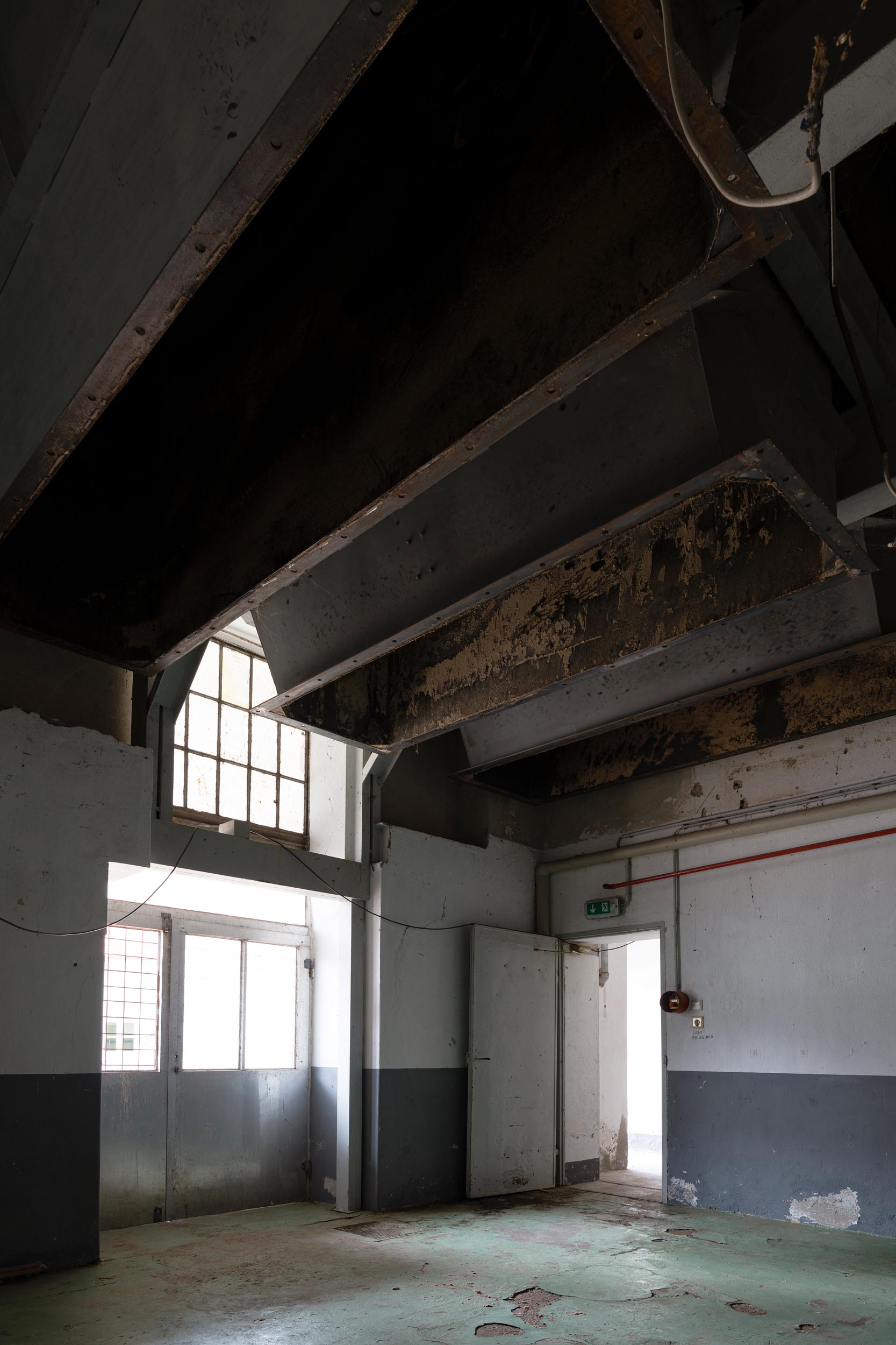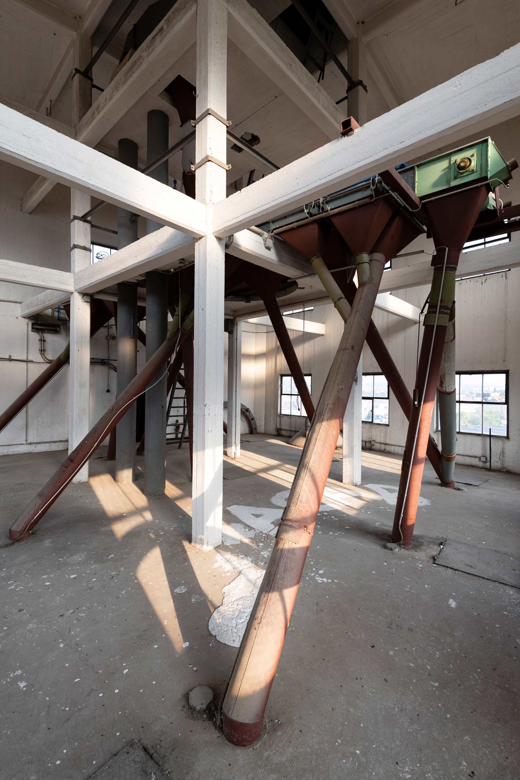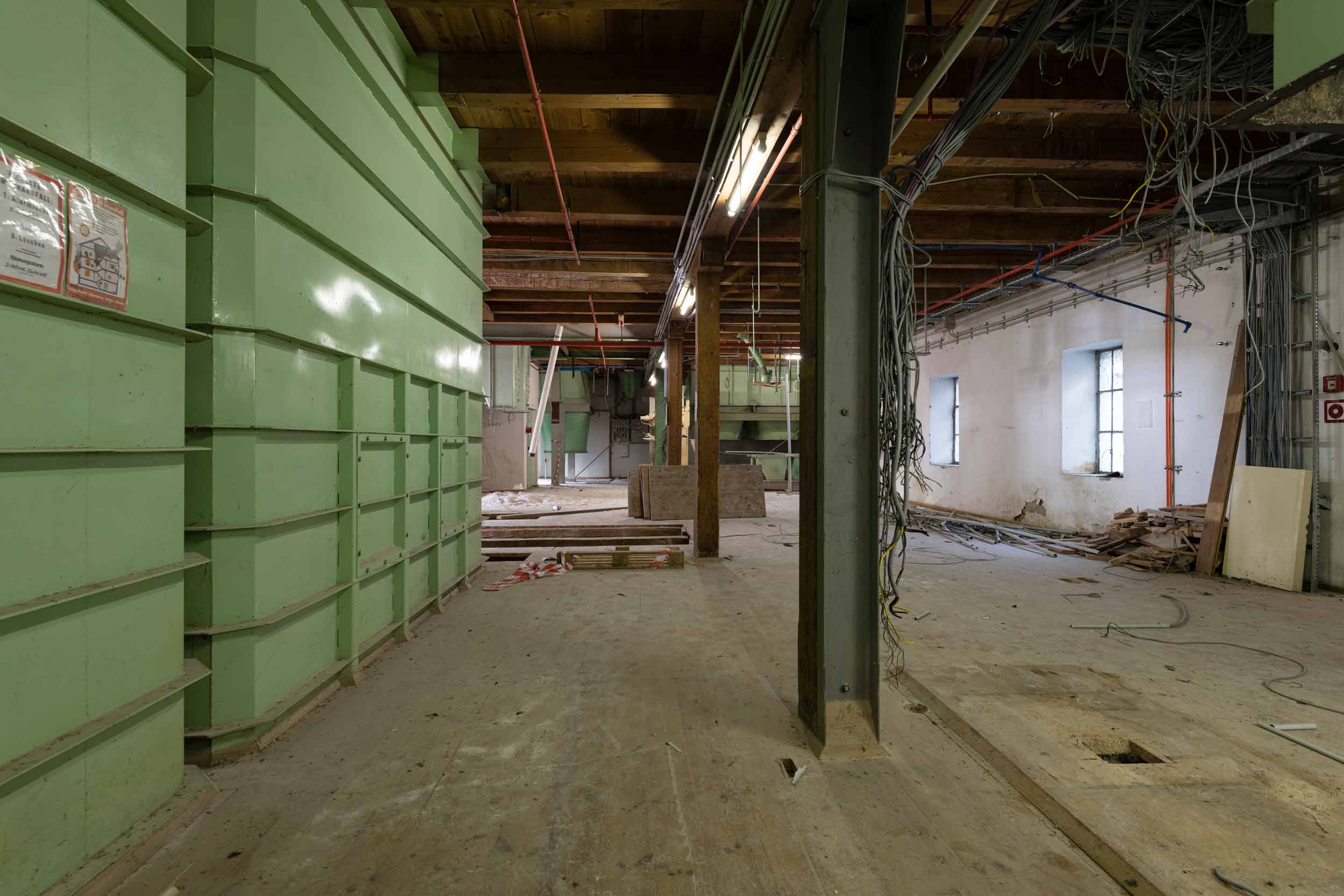 Löcher und Schrauben lassen erahnen, wo die Maschinen standen[48]. Zwischen ihnen spannte sich eine Choreografie aus Abläufen durch das gesamte Gebäude[15]. Arbeiter, Werkzeuge und Material bewegten sich in organisierten Rhythmen[73]. Physische Prozesse veränderten Konsistenzen. Dann nannte man das Korn nicht mehr Korn, sondern Mehl[27]. Dann nannte man den Arbeiter nicht mehr frisch und munter, sondern streichfähig[28]. Das Verständnis für die Organisation der Abläufe und deren Raumvolumen bildete die Grundlage der Architektur. Das Gebäude wuchs[3], um stetig eine formale Lösung für die Anforderungen der zeitgemäßen Mehlproduktion zu bieten.