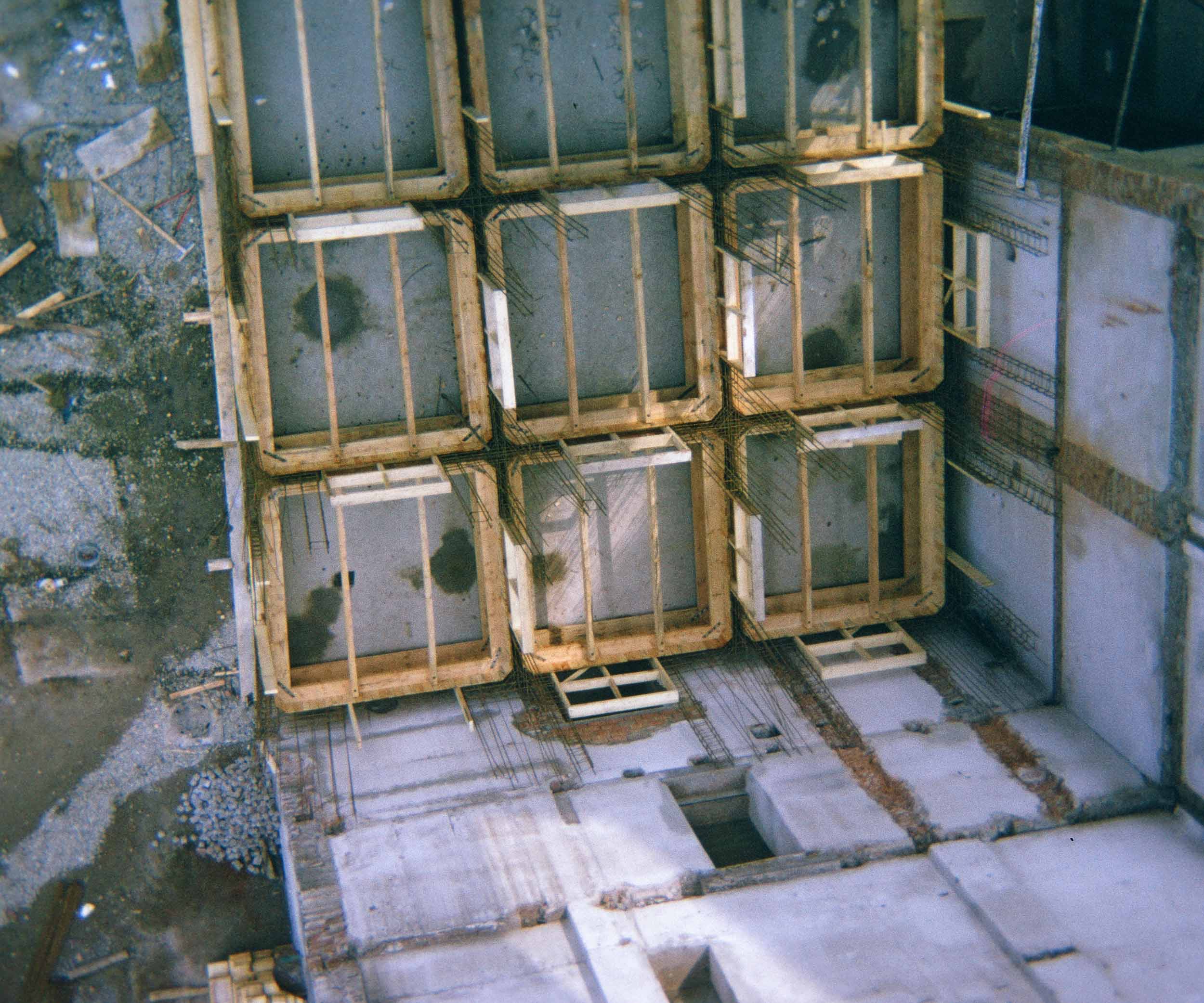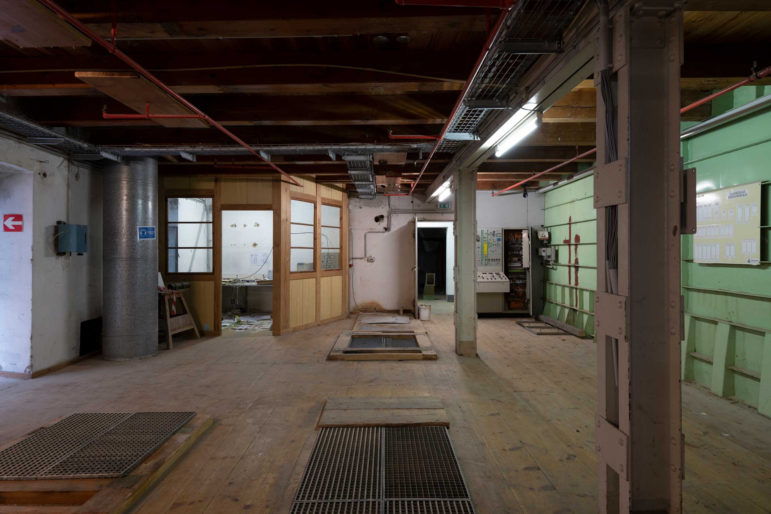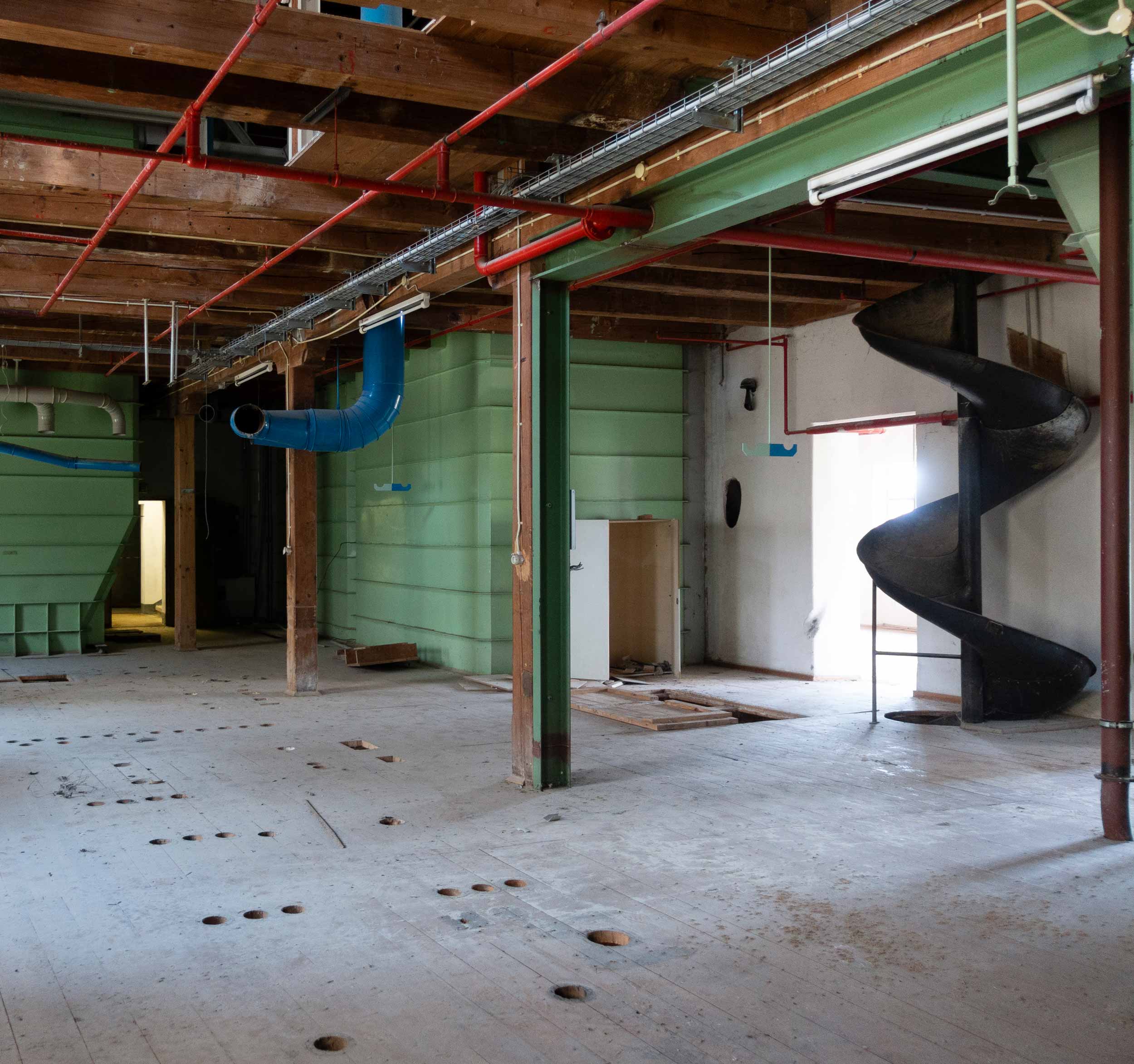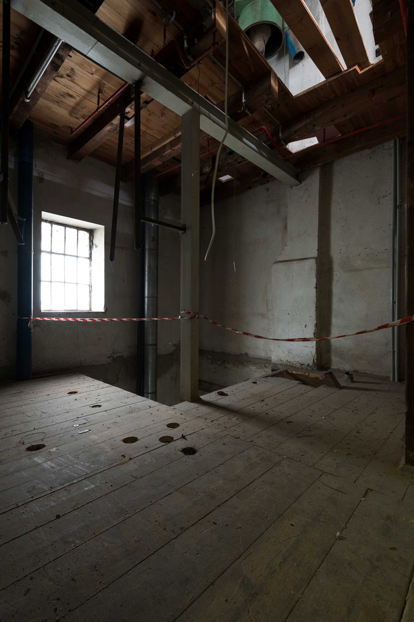 Löcher und Schrauben lassen erahnen, wo die Maschinen standen[48]. Zwischen ihnen spannte sich eine Choreografie aus Abläufen durch das gesamte Gebäude[15]. Arbeiter, Werkzeuge und Material bewegten sich in organisierten Rhythmen[73]. Physische Prozesse veränderten Konsistenzen. Dann nannte man das Korn nicht mehr Korn, sondern Mehl[27]. Dann nannte man den Arbeiter nicht mehr frisch und munter, sondern streichfähig[28]. Das Verständnis für die Organisation der Abläufe und deren Raumvolumen bildete die Grundlage der Architektur. Das Gebäude wuchs[3], um stetig eine formale Lösung für die Anforderungen der zeitgemäßen Mehlproduktion zu bieten.
