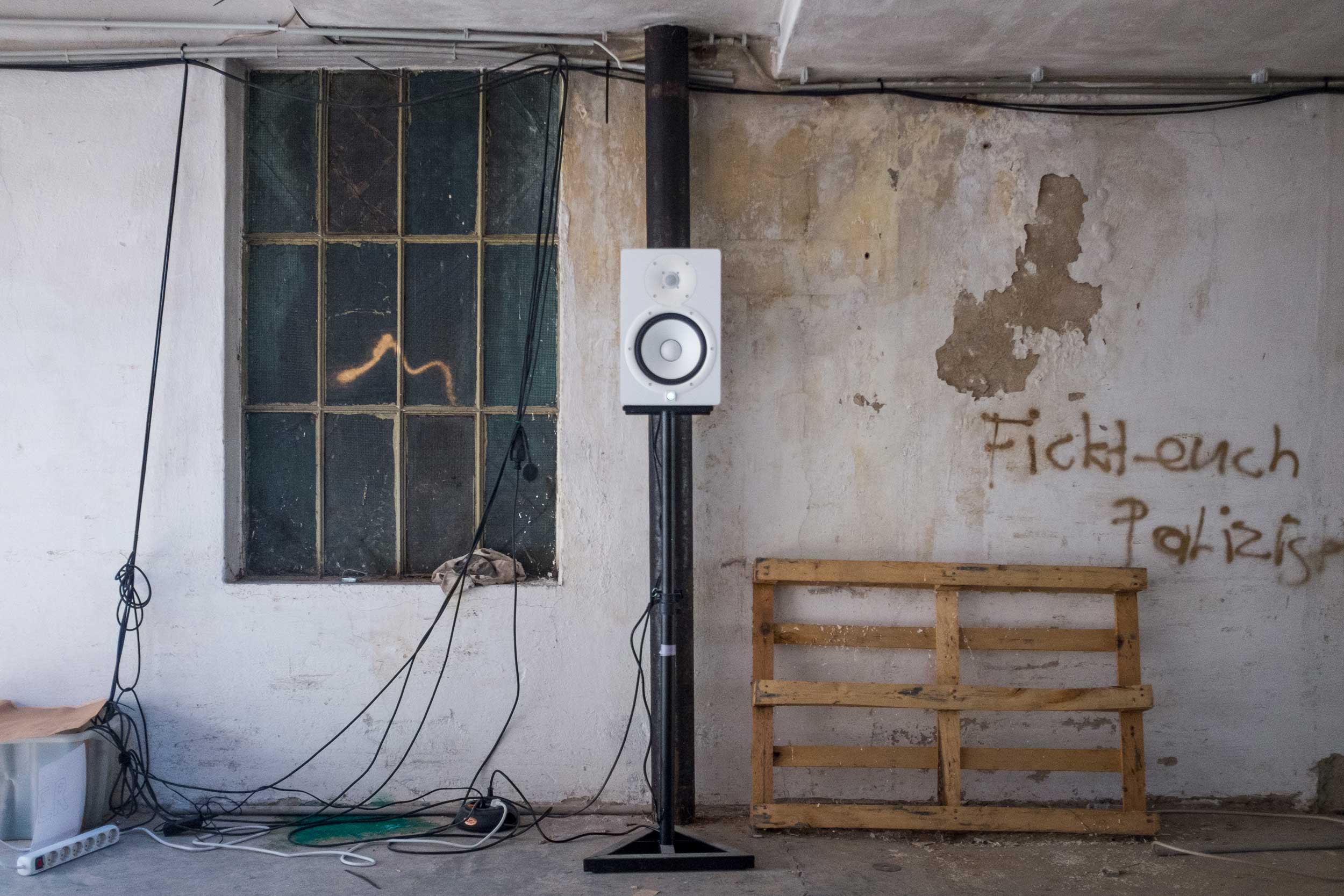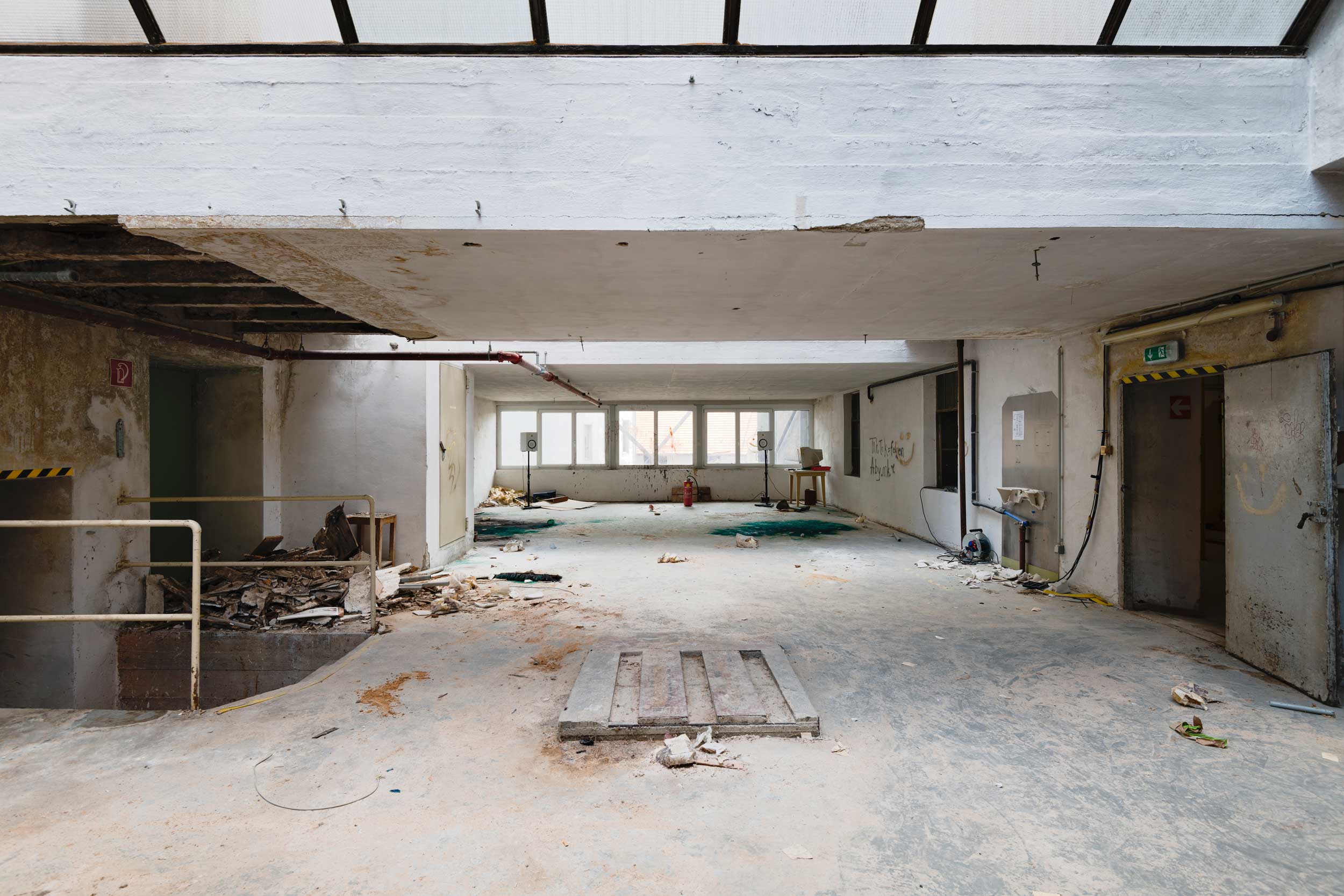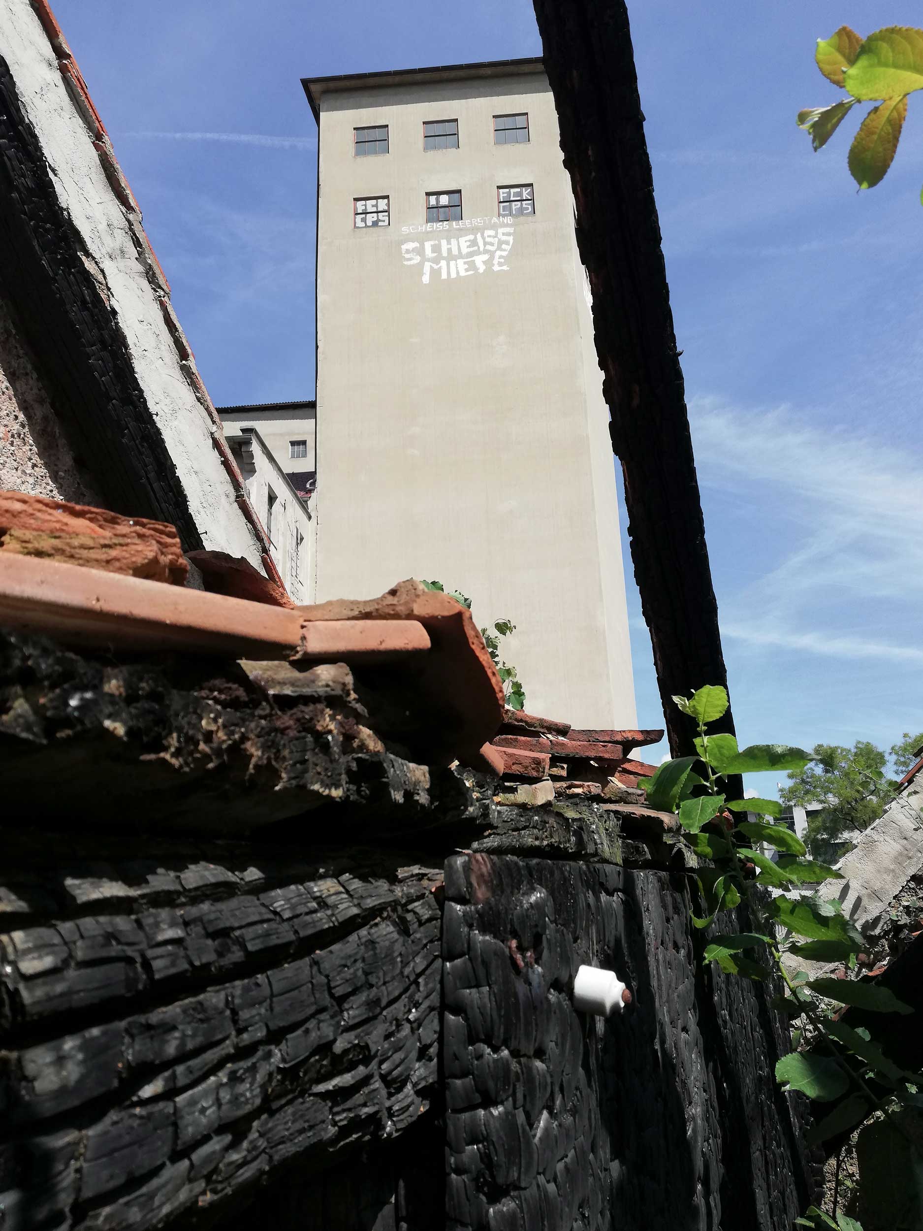 Pflanzen wuchern[6] in einem verbrannten Gebäude am Rand des Geländes. Die Nachbarin ruft aus Angst die Polizei, als sie Geräusche von splitterndem Glas hört. Über den schon labil eingedellten Zaun gesprungen können die vier Einsatzkräfte die befürchteten Jugendlichen nicht festnehmen. Ein Vertrag mit der Besitzerin legitimiert die Präsenz der randalierenden Künstler*innen[76], die zerbrochene Fenster mit einem Hammer von möglichen Verletzungsgefahren säubern, um die Auflagen für Veranstaltungen zu erfüllen. Handläufe werden angebracht[70], Löcher geschlossen[42], Stoßkanten markiert[37], Stolperfallen beseitigt[38], Statik geprüft[71], Toiletten in Betrieb genommen. Aus dem Arbeiterhaus[13]fällt wieder Licht auf die Straße.