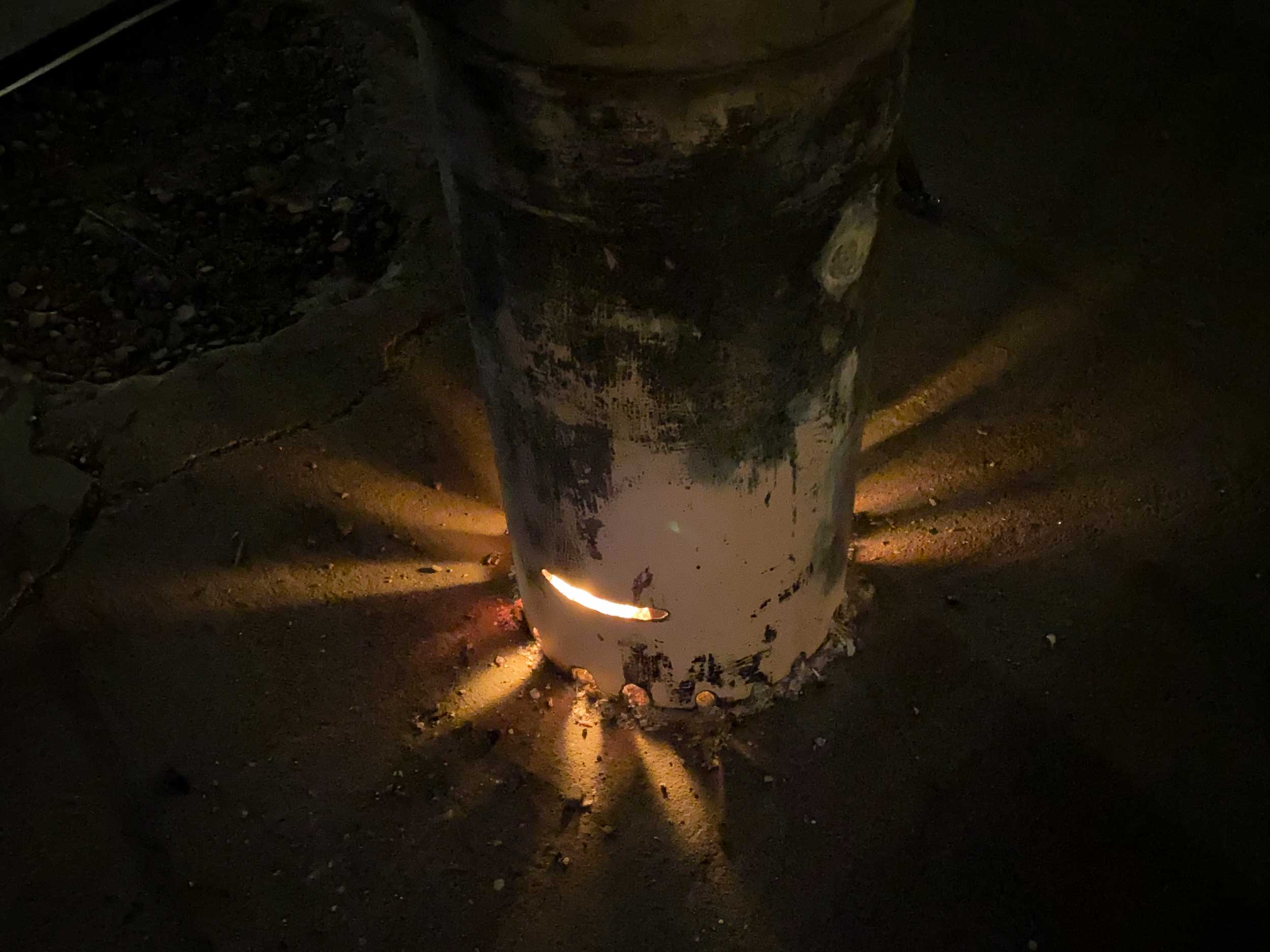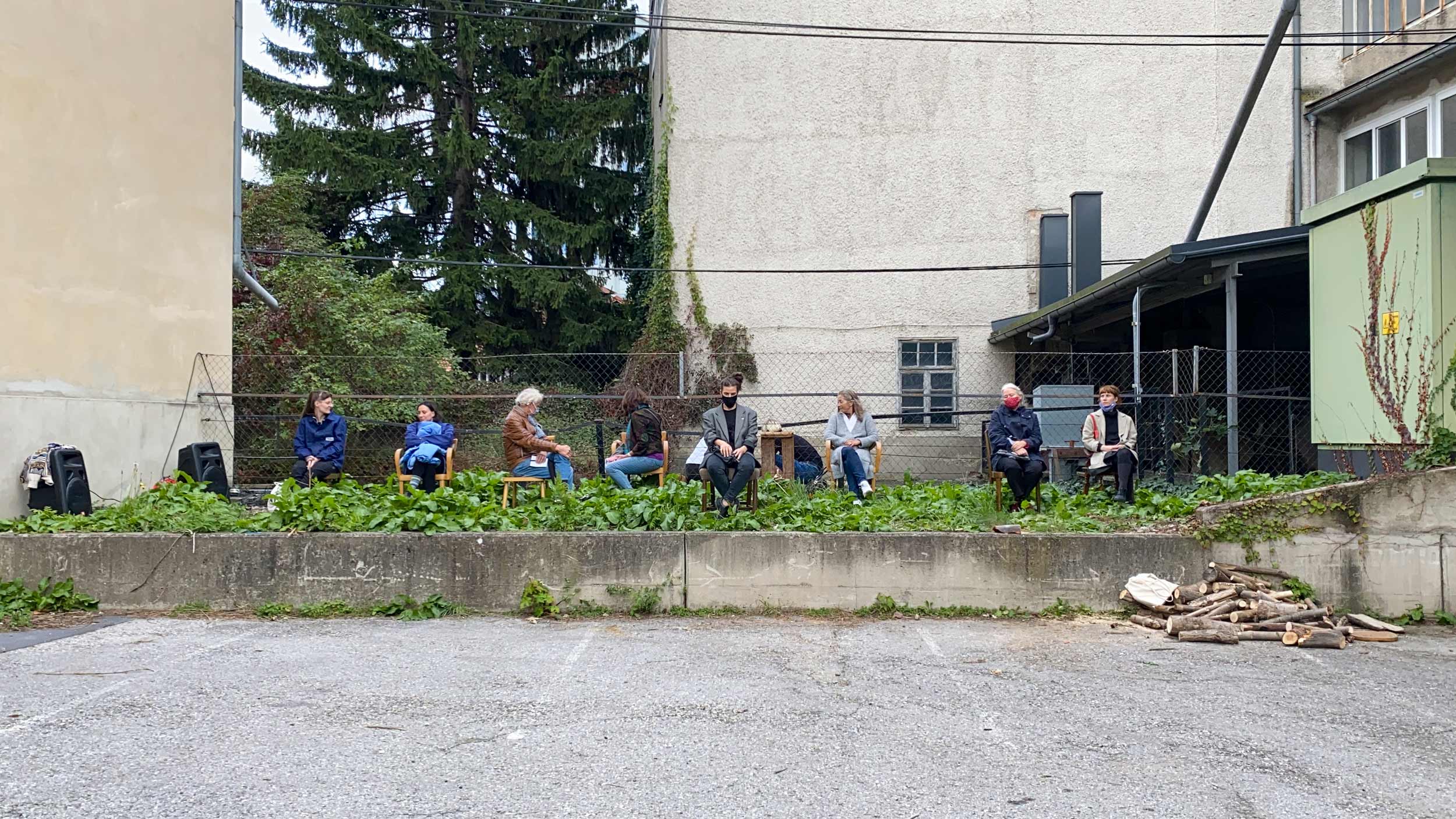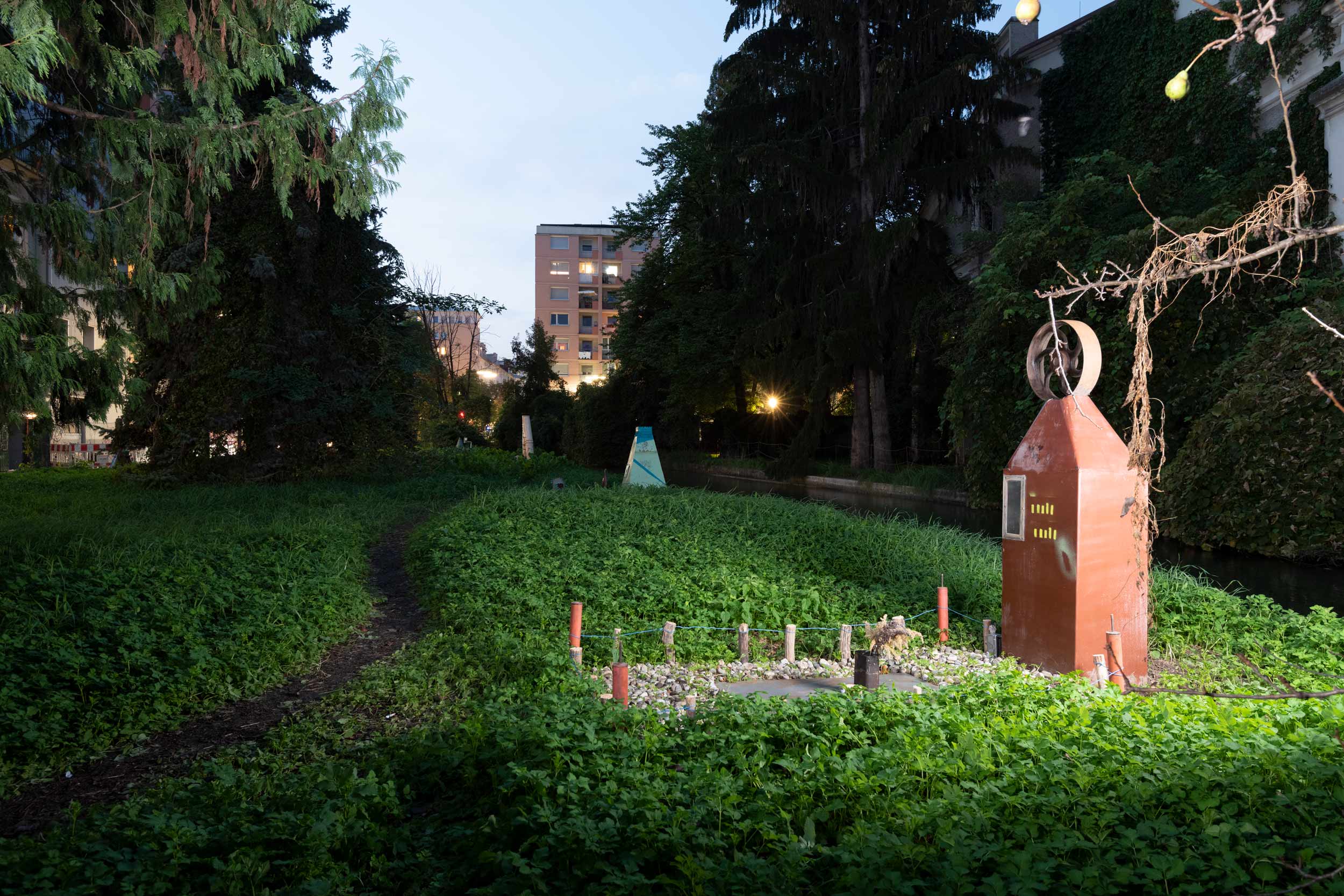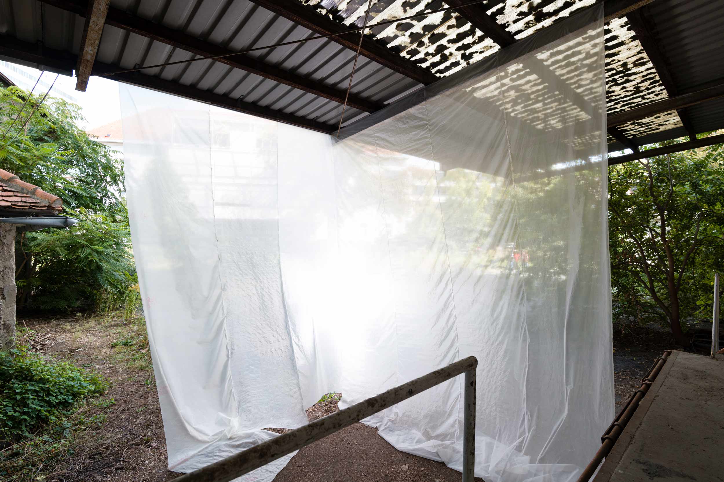 Pflanzen wuchern[6] in einem verbrannten Gebäude am Rand des Geländes. Die Nachbarin ruft aus Angst die Polizei, als sie Geräusche von splitterndem Glas hört. Über den schon labil eingedellten Zaun gesprungen können die vier Einsatzkräfte die befürchteten Jugendlichen nicht festnehmen. Ein Vertrag mit der Besitzerin legitimiert die Präsenz der randalierenden Künstler*innen[76], die zerbrochene Fenster mit einem Hammer von möglichen Verletzungsgefahren säubern, um die Auflagen für Veranstaltungen zu erfüllen. Handläufe werden angebracht[70], Löcher geschlossen[42], Stoßkanten markiert[37], Stolperfallen beseitigt[38], Statik geprüft[71], Toiletten in Betrieb genommen. Aus dem Arbeiterhaus[13]fällt wieder Licht auf die Straße.