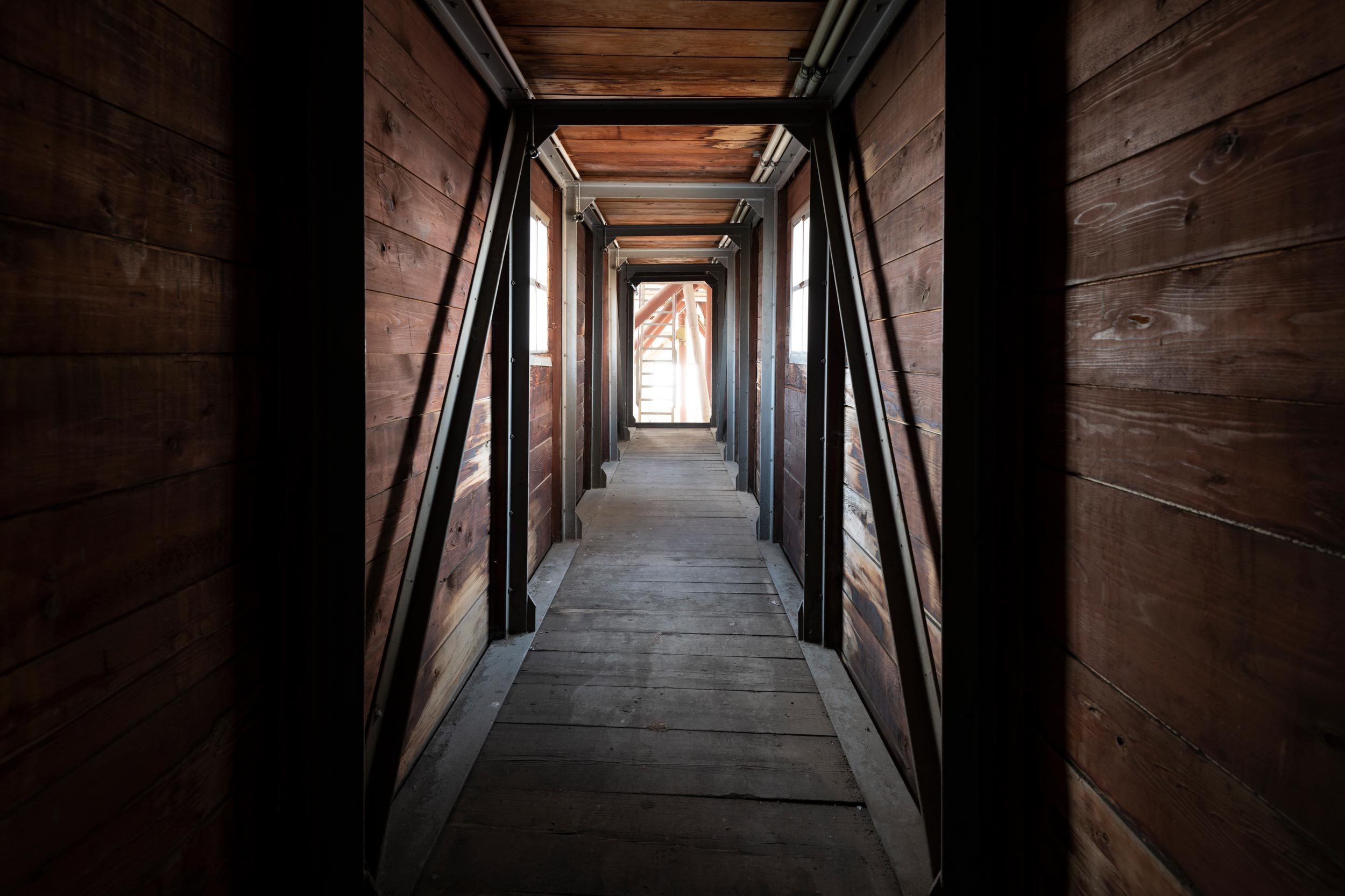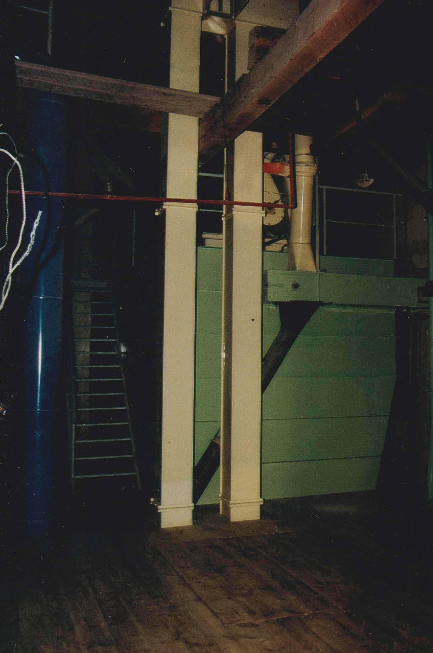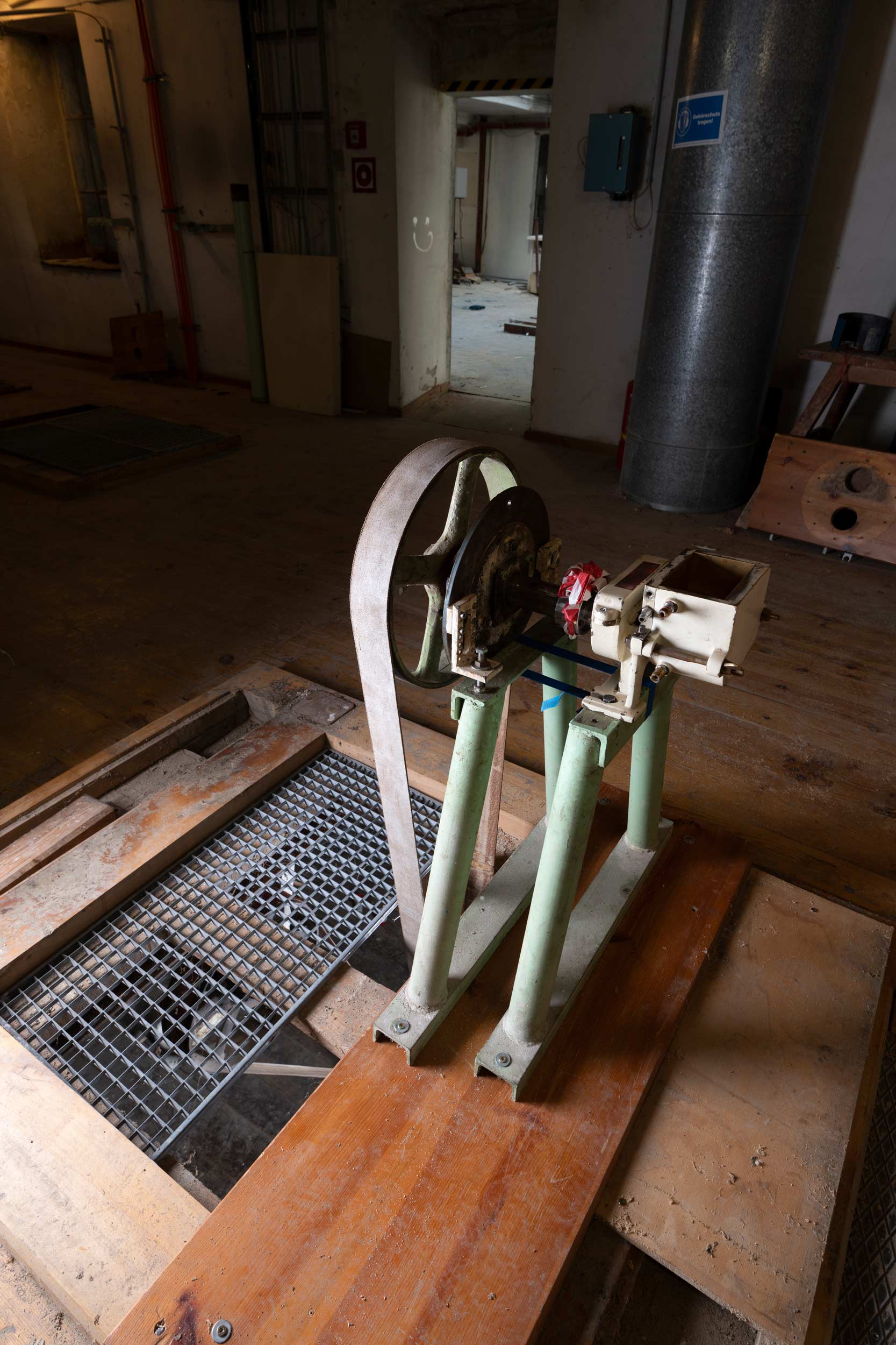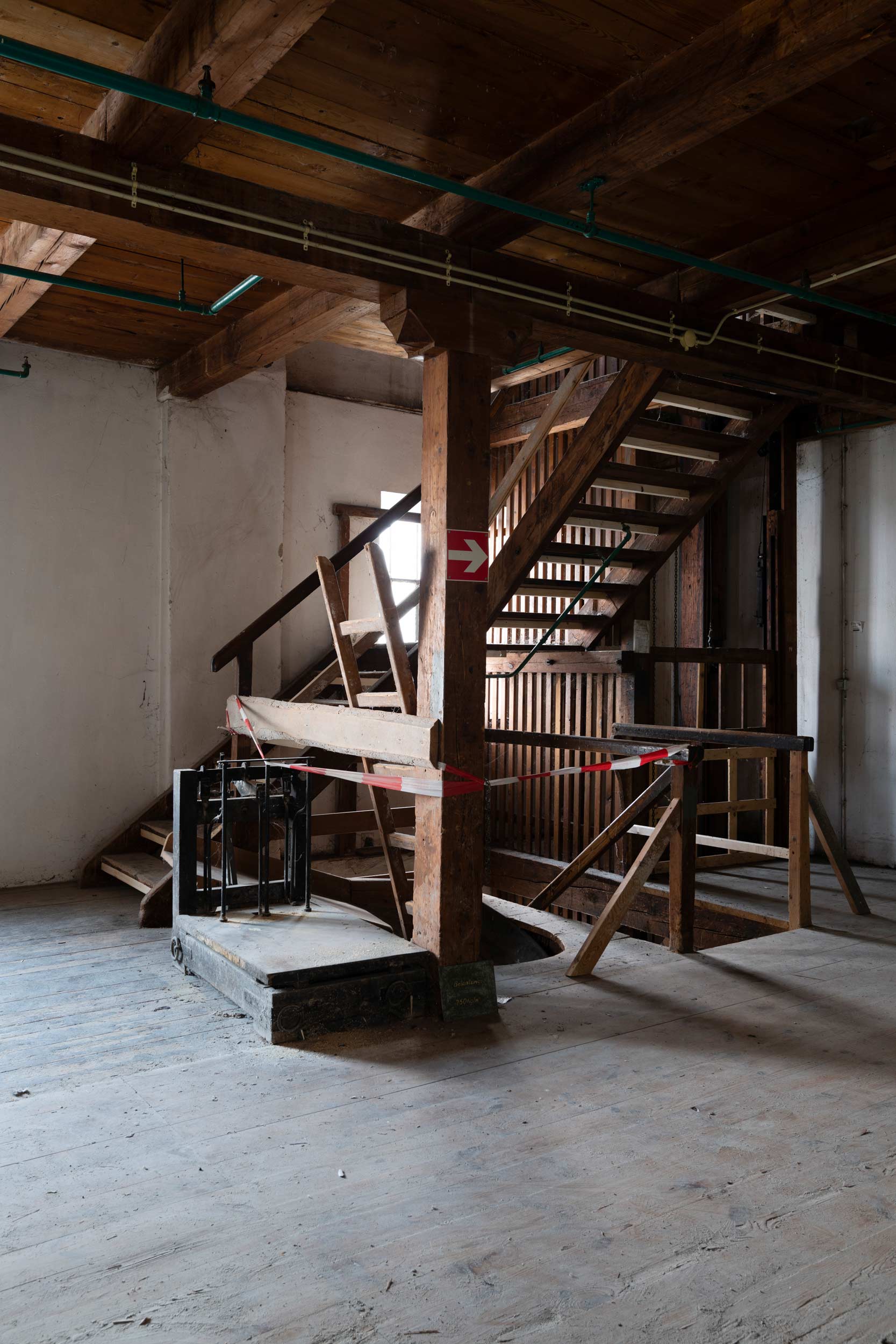 Man sieht dem Gebäude die voluminösen Bewegungen an. Man hört die unermüdliche Energiegewinnung aus dem rauschenden Mühlgang und in der dröhnenden Turbine[62], spürt in Beinen und Lunge, was es bedeutet, Gewicht in die Höhe der Türme zu bewegen[16, 96], sieht von außen hinaufschauend die potenzielle Energie gelagerter Masse in den Silo-Türmen über sich ragen[62], entdeckt Förderbänder[74], auf Mehlsäcke konfektionierte Paletten[53]und die breiten Keilriemen, die an der Antriebswelle nur noch hängen[63]. Insgeheim würde man gerne die gezwirbelte Rutsche durch das ganze Gebäude hinunterrutschen[48, 55]. Der Ort vereint eine Vielzahl unterschiedlicher Raumqualitäten. Ecken, Kanten, Flächen in unterschiedlichen Größenverhältnissen stehen im Verhältnis begründbarer Funktion zueinander. Antreiben, transportieren, lagern, verarbeiten ... Das Bewegungsrepertoire des Mehlmahlens ist in den Körper der Mühle eingeschrieben, in seinen Raumvolumen und Raumverbindungen. Die Atmosphäre schmeckt noch heute nach Bewegungen.[84]