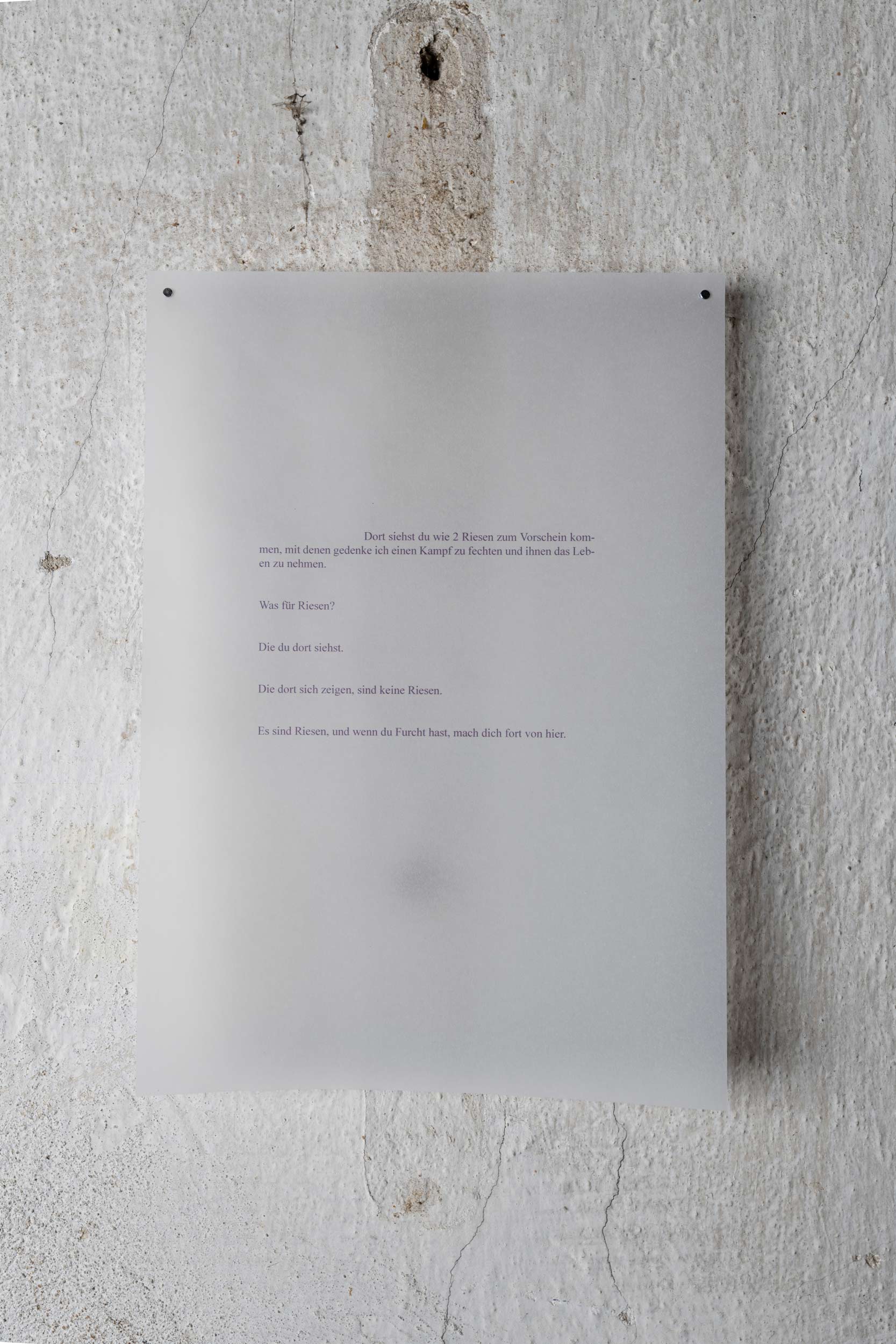 Wie viele Menschen befinden sich wohl in diesem Moment in der gleichen Körperhaltung, erleben physisch eine ähnliche Situation? Welchen Einfluss hat die Praxis einer Arbeit auf den Bezug zur Umgebung? Auf den Bezug zum eigenen Leben? Wie formt sie die Räume, in denen wir uns bewegen? Wie formen die Räume uns? Welche Landschaften aus unmittelbar physischen Wahrnehmungen, die von Moment zu Moment in der Aufmerksamkeit erscheinen, verweilen und verebben, betreten wir im Laufe unseres Lebens? Was betraten wir? Was verließen wir?